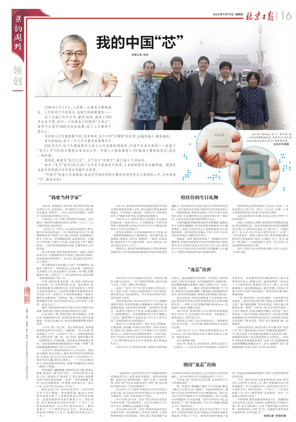 1.胡伟武,男,1968年11月出生,龙芯中科技术股份有限公司董事长。他二十年坚守自主研发,终结中国“无芯”历史。主持研制龙芯自主指令系统“龙架构”,推动CPU从“可用”迈向“好用”,达到世界先进水平。带领公司科创板上市,成为国产CPU第一股,为我国信息产业发展注入强劲动力。作为中国科学院大学博士生导师,躬耕育人,为芯片产业培养大批骨干人才。