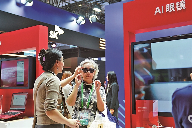 参观者在国家会展中心(上海)试戴一款AI眼镜。新华社发