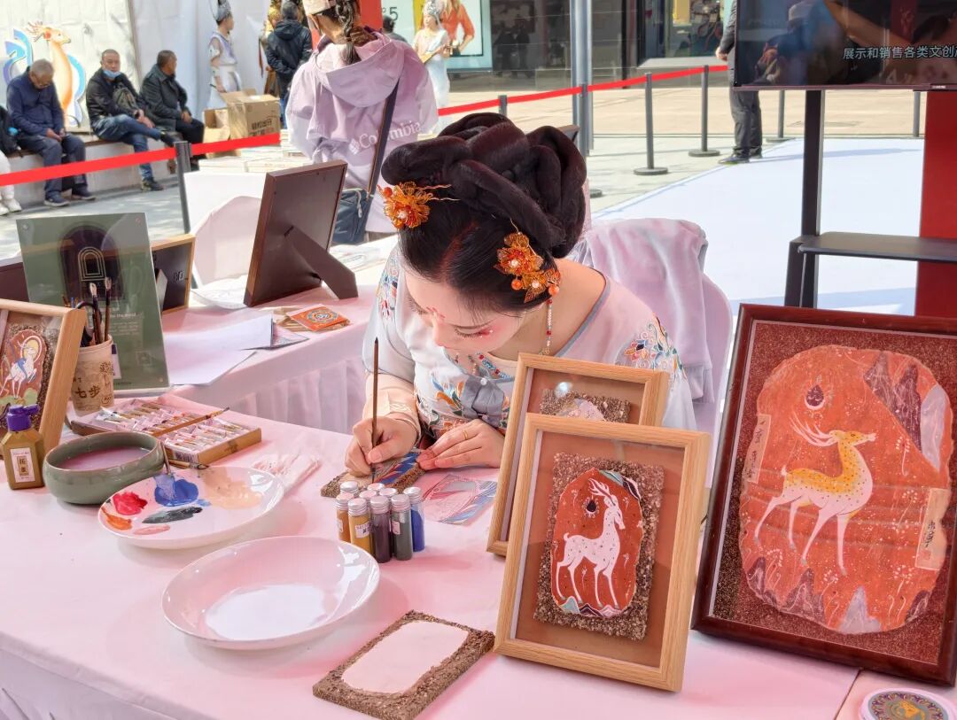 研学课程区里,一位工作人员正手持画笔,蘸着彩色颜料在画板上细致描绘敦煌壁画,这正是敦煌特色研学课程的现场演示。旅拍展区内,各式精美汉服层层叠展,丰富多样的款式瞬间吸引了许多女性顾客的目光。在摄影及美术作品展区,一幅幅作品将敦煌的绝美风光与人文底蕴缓缓展现,让观众仿佛置身敦煌,沉浸式感受大漠丝路的独特之美。在打卡拍照区域,身着精美汉服、化着独特妆容的工作人员面带微笑地站在背景板前,热情地迎接每一位游客前来合影。