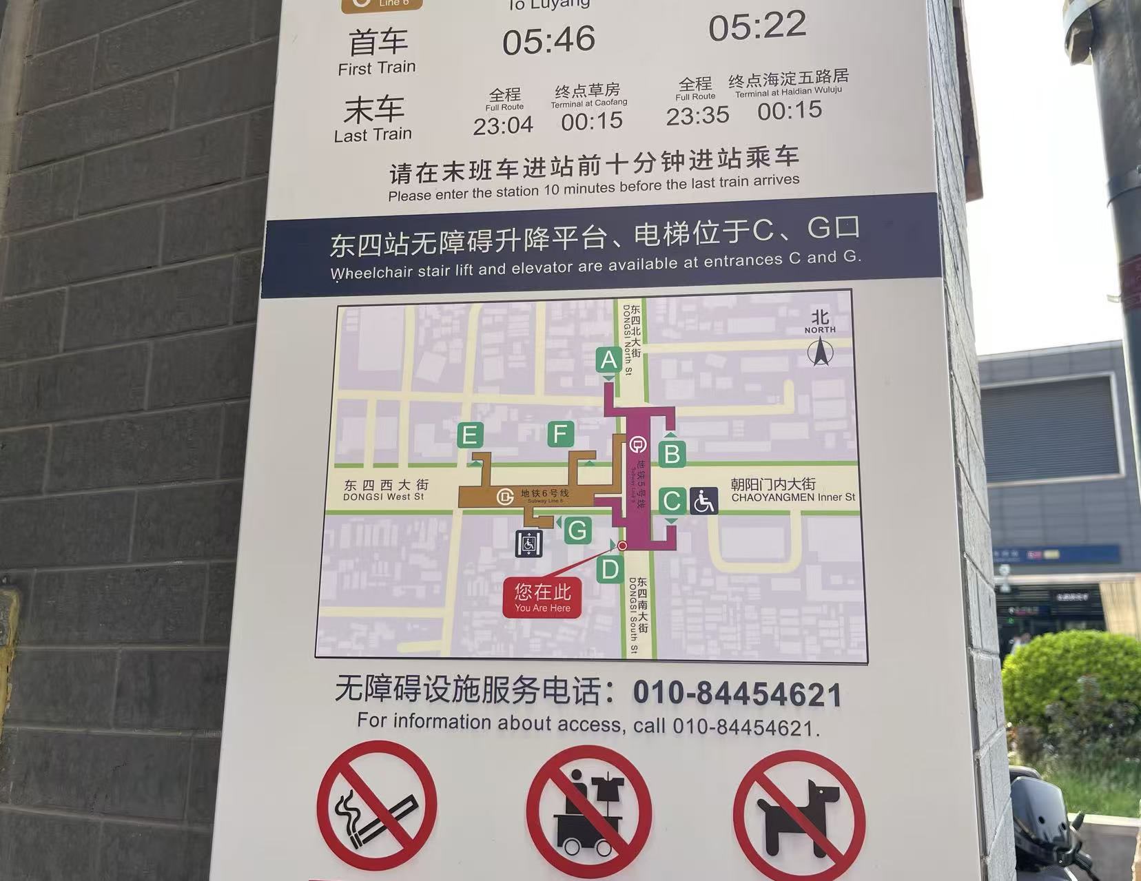记者在东四站看到,该站7个出入口同样采用“统一模板”:A、B、C、D口连接5号线,E、F、G口连接6号线,所有站外标识均按照“5号线、6号线”的顺序标注。同样,在2号线与6号线换乘的车公庄站,5个出入口也都是按照“2号线、6号线”顺序统一标注。