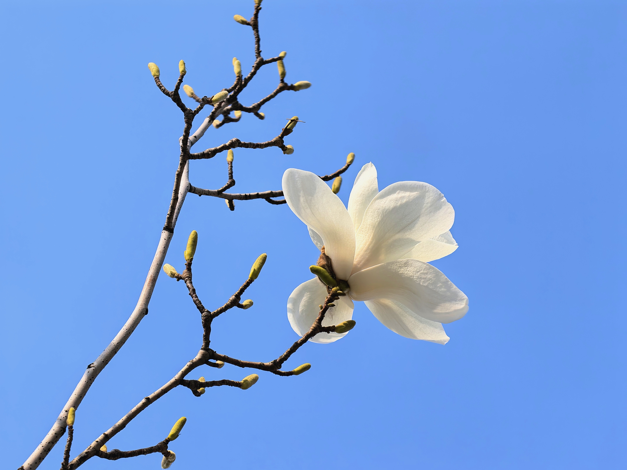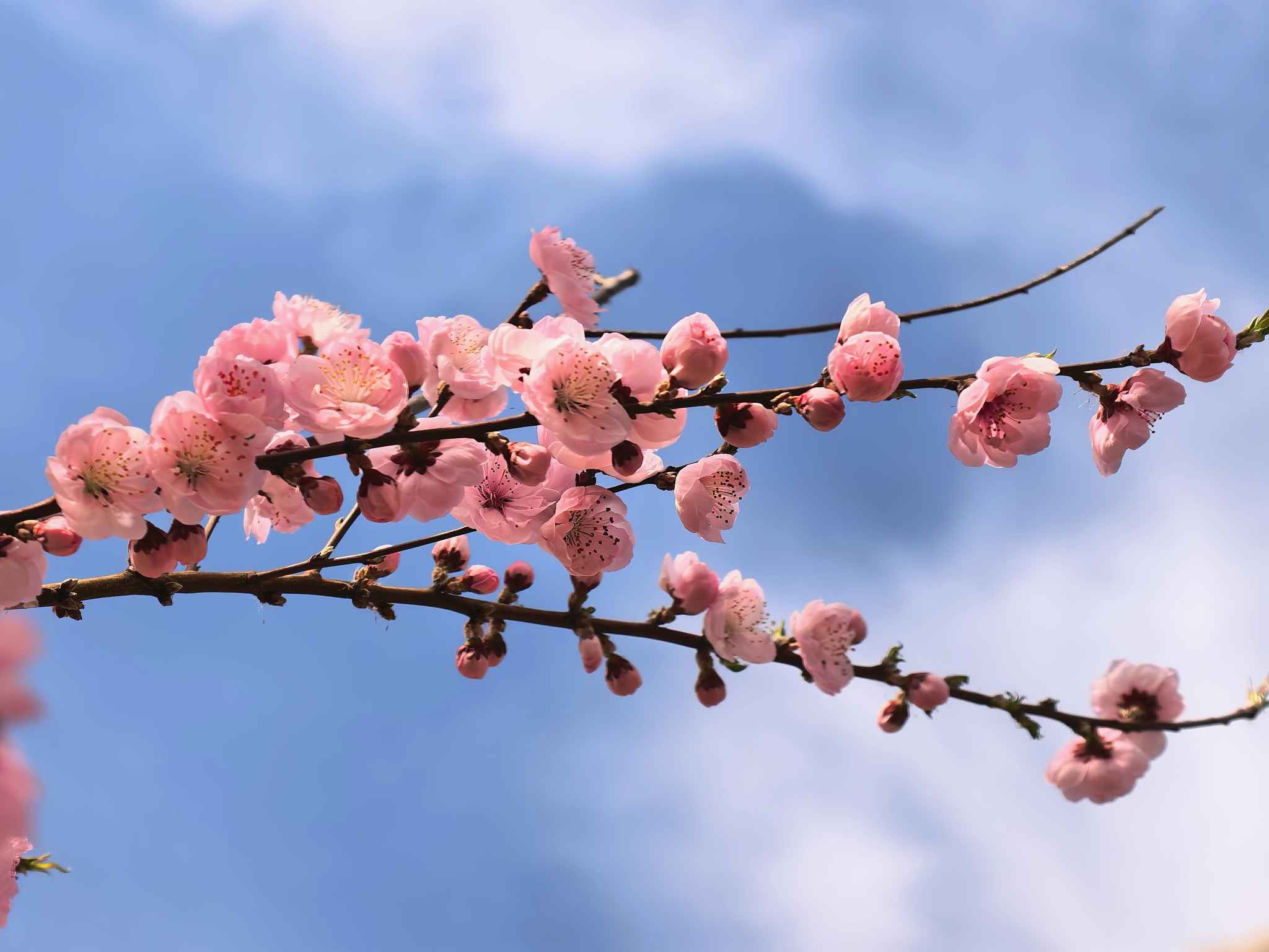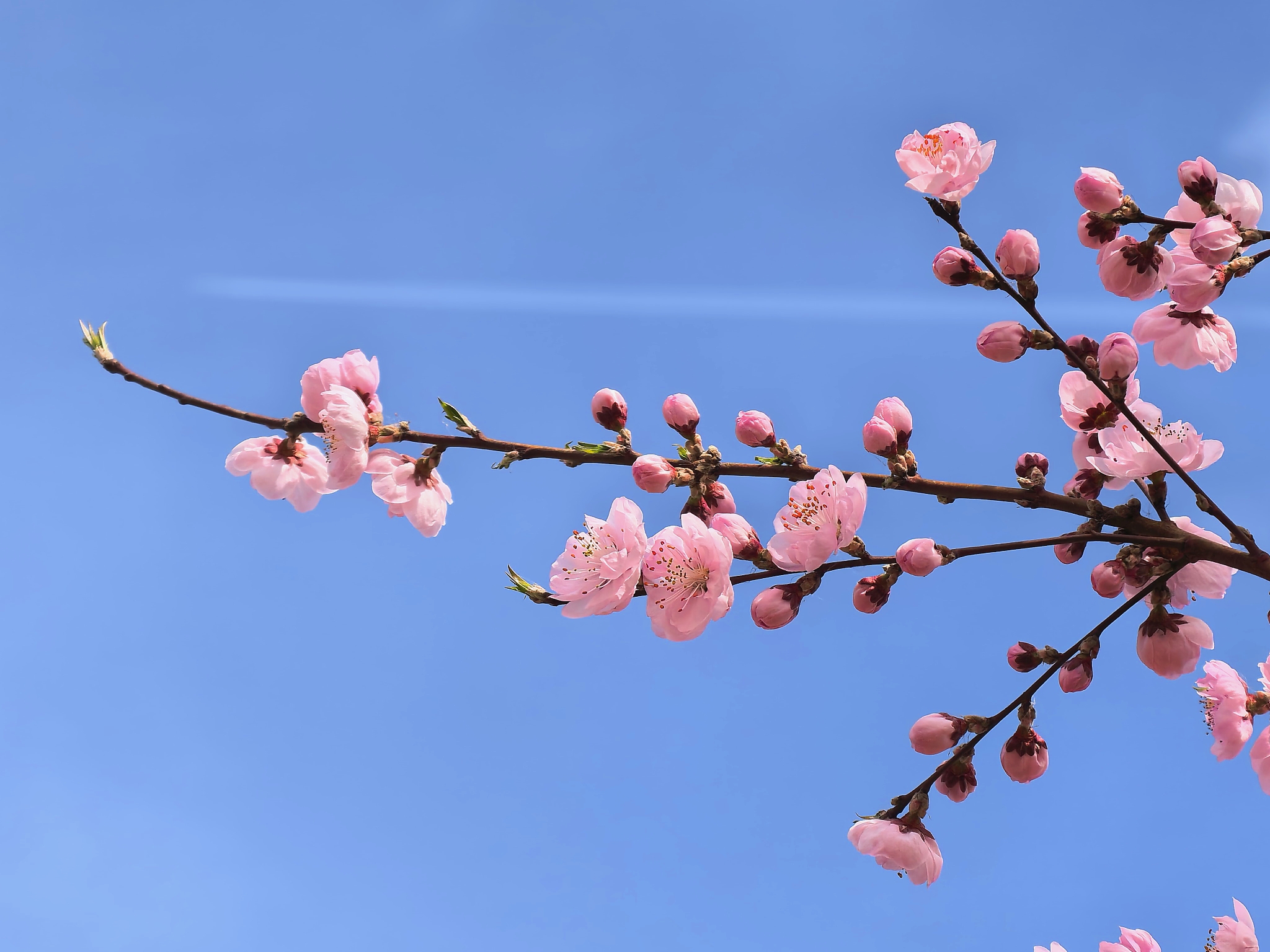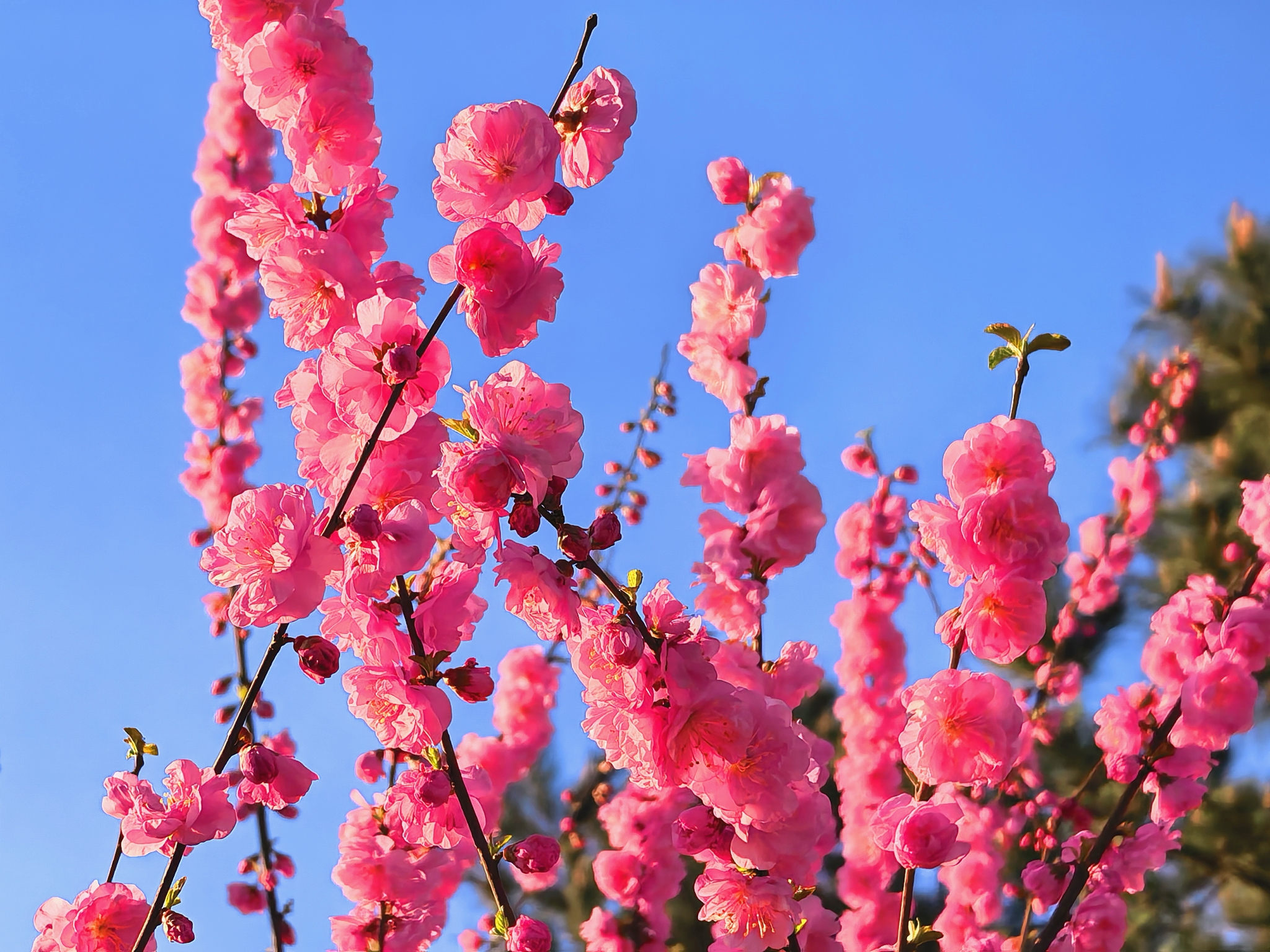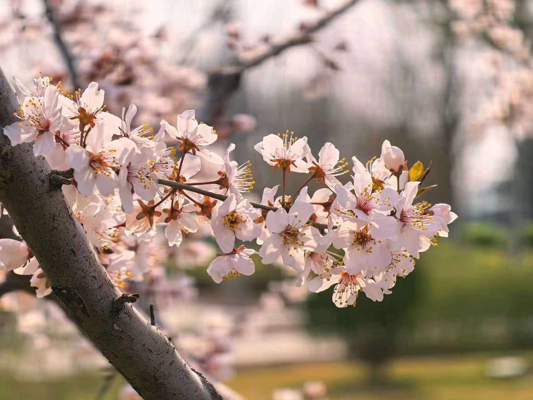4月7日,北京天空湛蓝,通州镜湖之滨景区多种花卉绽放,春意盎然。