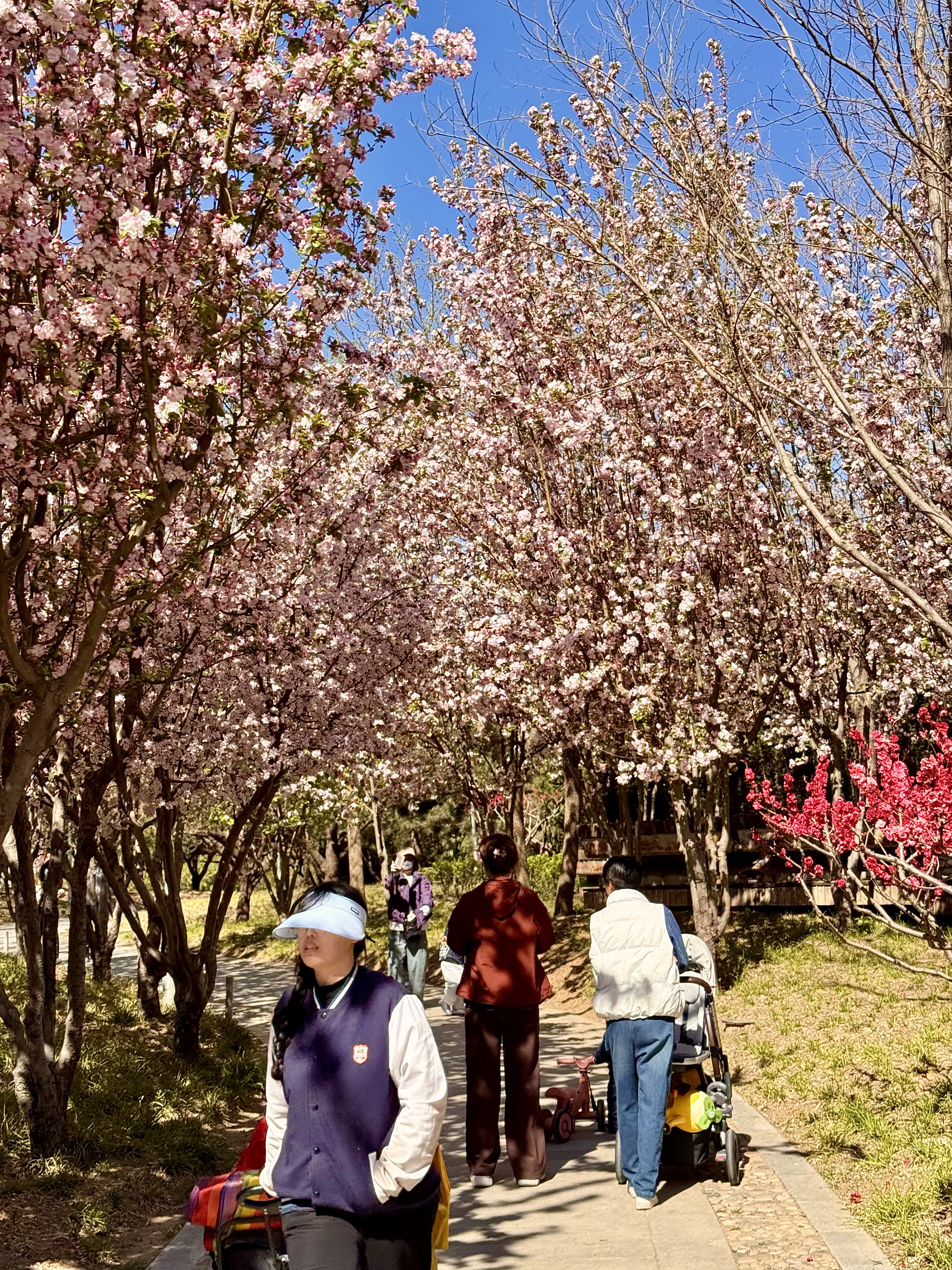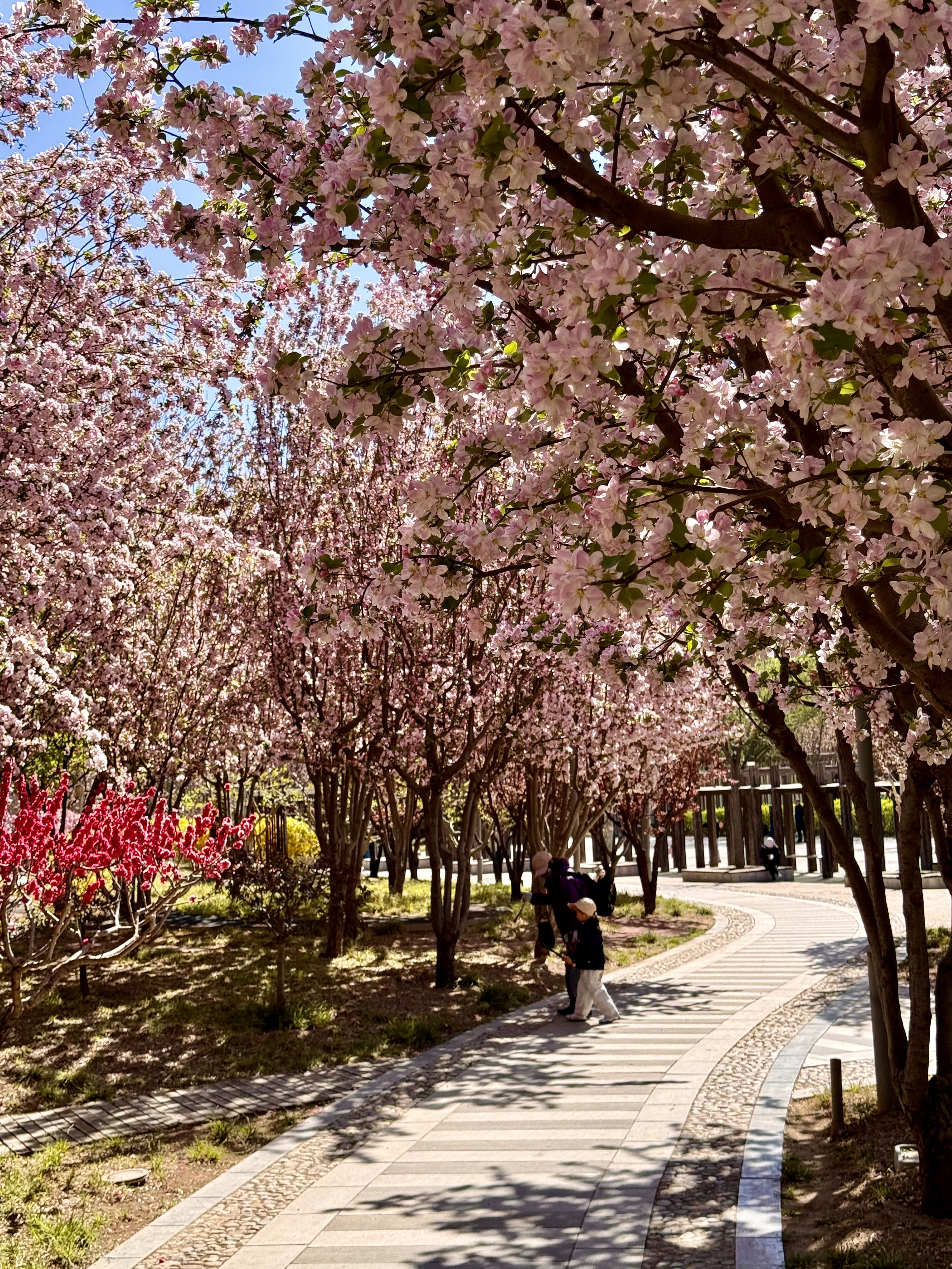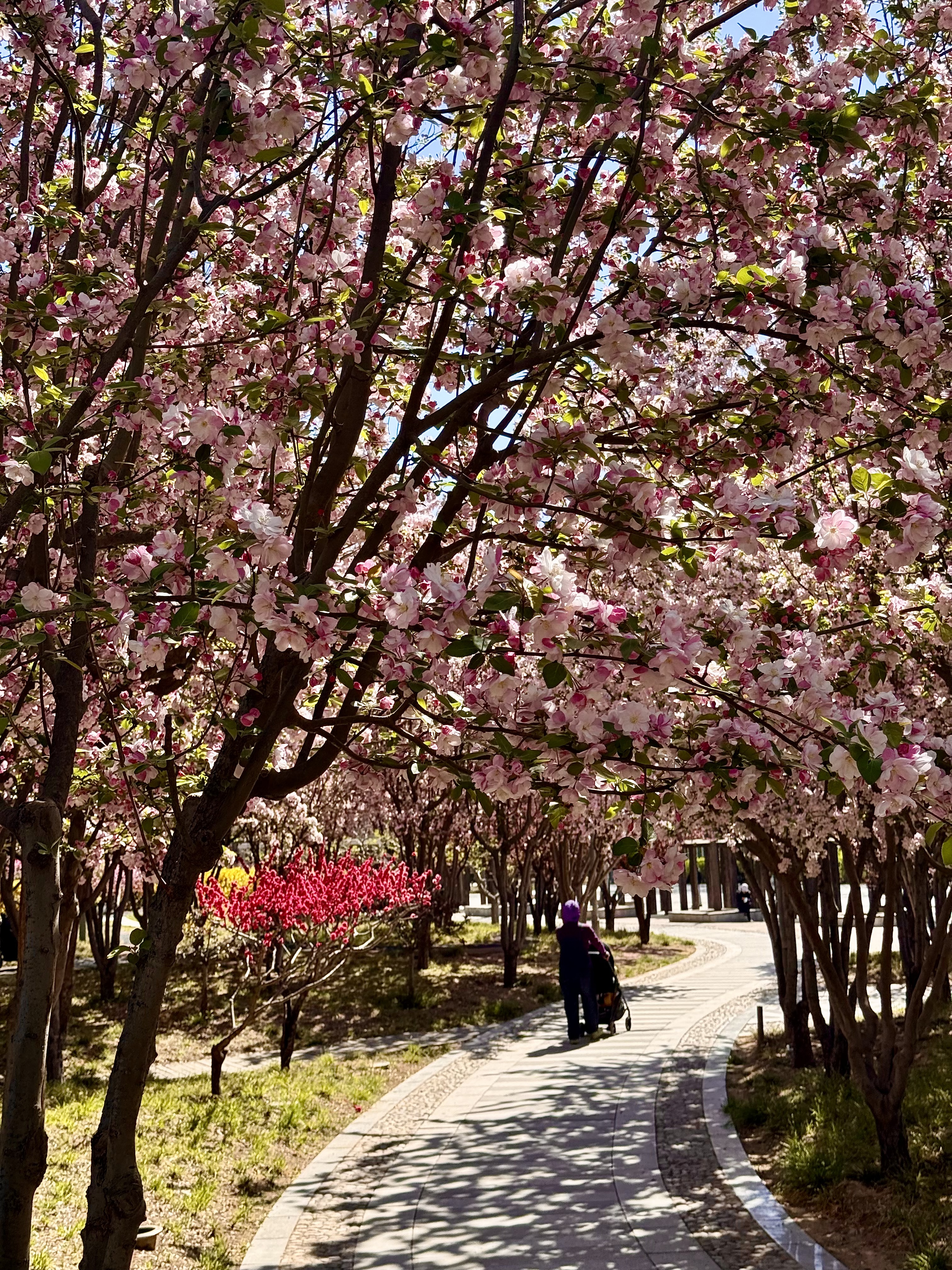 4月7日,望京桐城公园的海棠花盛开,园区小道曲径通幽,春意盎然。