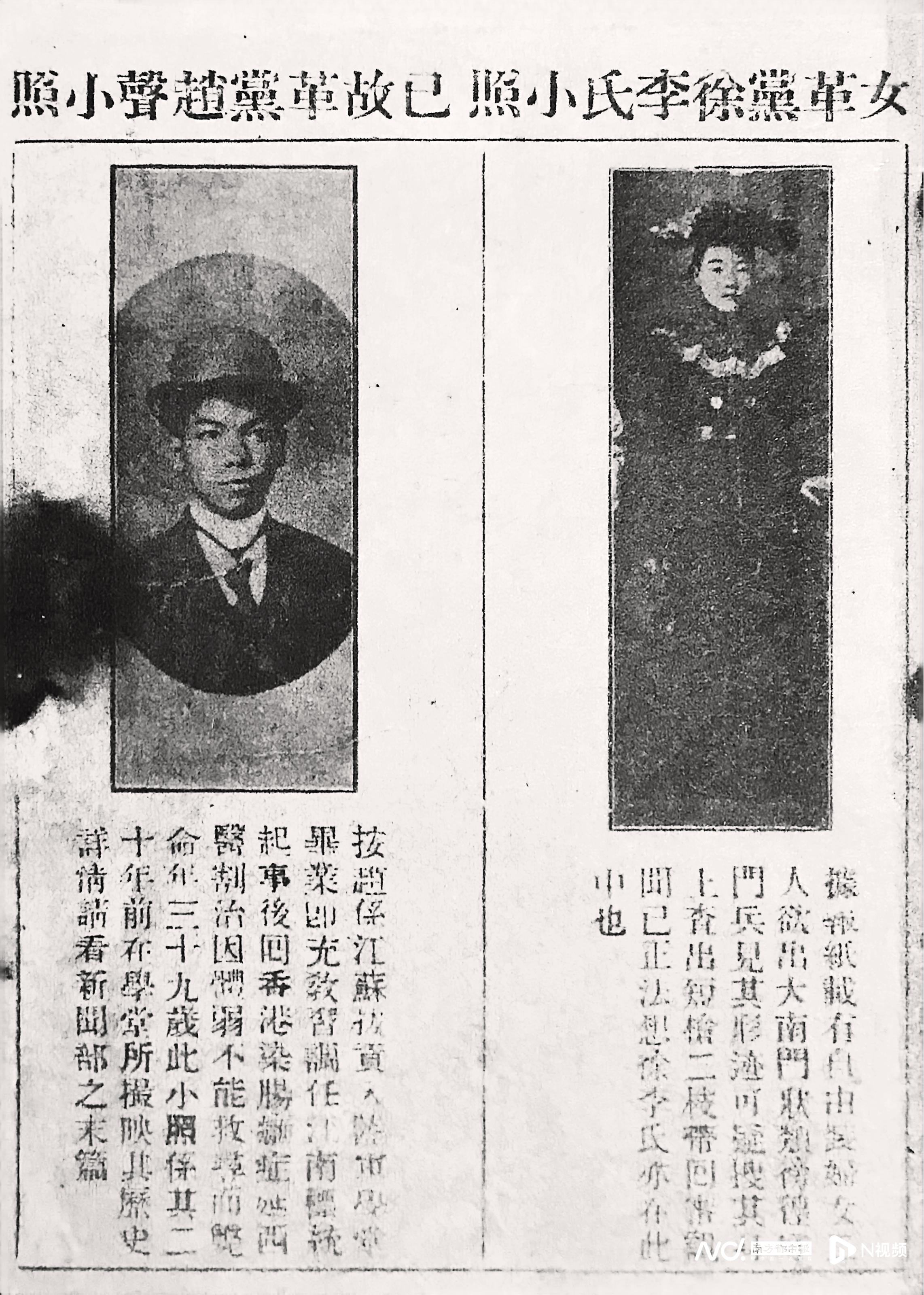 清廷关于黄花岗起义的通缉令上印着两张肖像,左为起义原定总指挥赵声,右为徐宗汉女士。