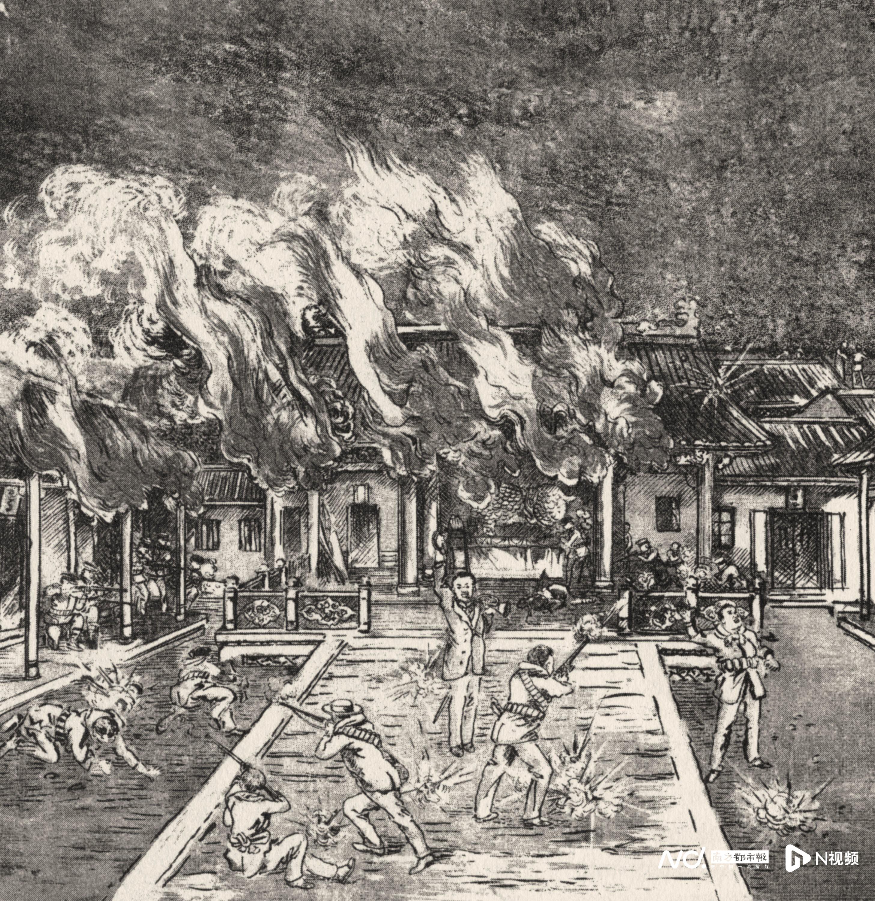 黄花岗起义亲历者潘达微亲绘表现起义实况的《焚攻督署》,刊载于1911年7月《平民画报》。该漫画以白描手法再现攻打两广总督署的激战场景,成为现存最早直观记录黄花岗起义的视觉史料,也是近代中国最早的漫画代表作品。