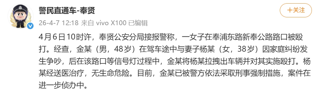 4月6日10时许,奉贤公安分局接报警称,一女子在奉浦东路新奉公路路口被殴打。经查,金某(男,48岁)在驾车途中与妻子杨某(女,38岁)因家庭纠纷发生争吵,后在该路口等信号灯过程中,金某将杨某拉拽出车辆并对其实施殴打。杨某经送医治疗,无生命危险。目前,金某已被警方依法采取刑事强制措施,案件在进一步侦办中。