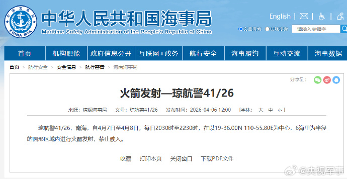 据中国海事局网站消息,清澜海事局发布航行警告,4月7日至4月8日,每日20点30分至22点30分,南海部分海域进行火箭发射,禁止驶入。