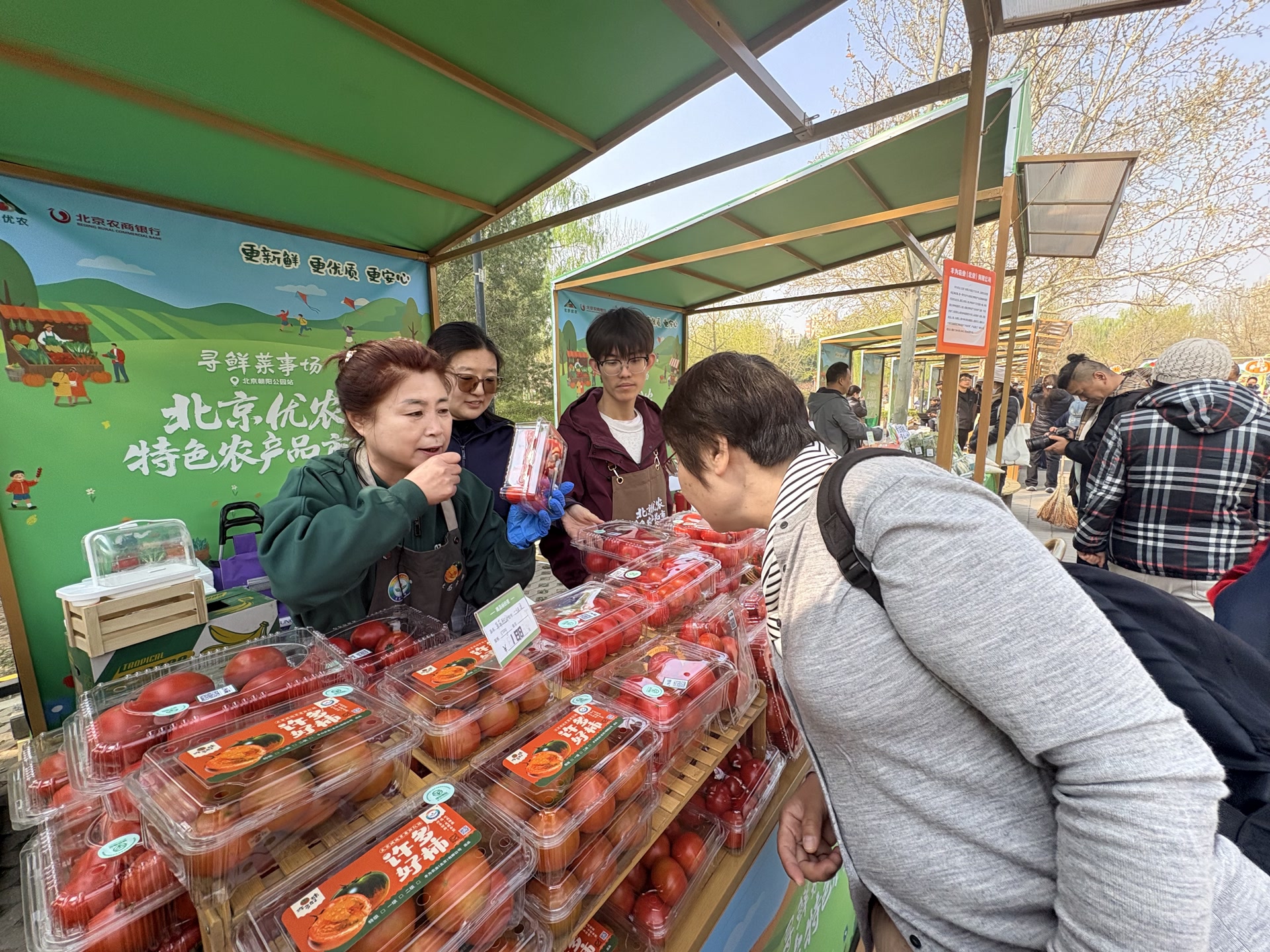 不远处,丰为农业(北京)有限公司的展位前同样人气十足,其带来的碱地草莓西红柿色泽红润、个头饱满,隔着保鲜盒都能闻到淡淡的果香。“我们公司位于通州区漷县镇,这里的土地历经北运河、凉水河等千年河道的滋养,形成了独特的弱碱性土壤,我们还特意给水土做了‘体检’,确认完全符合优质水果西红柿的种植条件。”工作人员指着展位上的产品介绍道,“我们的碱地草莓西红柿已经成功入驻了60多家果多美水果连锁店和中石油昆仑好客便利店,今天带到市集上,就是想让大家近距离品尝这份来自通州的自然风味。”市民们纷纷拿起西红柿品尝,酸甜适口的口感赢得了一致好评。