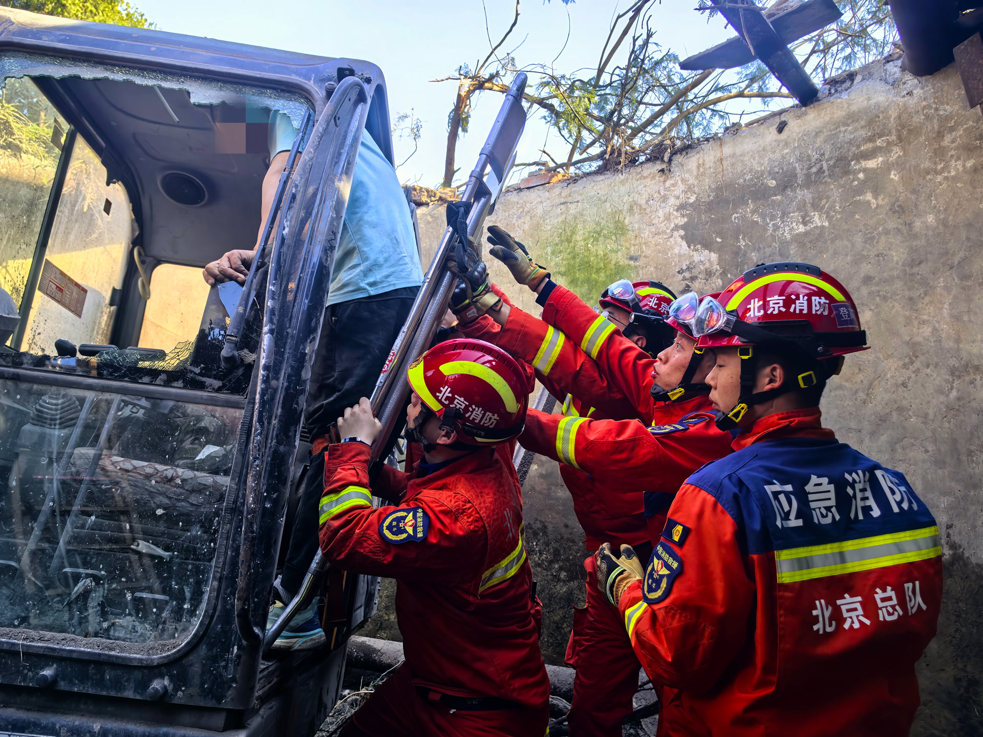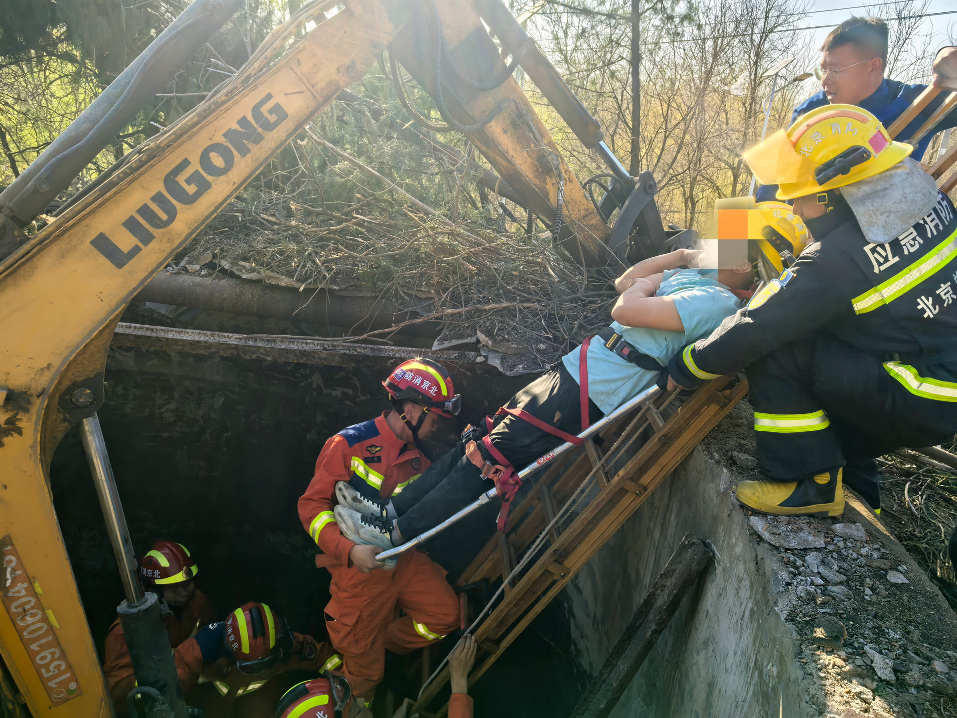 “我同事开着挖掘机不小心掉到井里了,受伤了,动不了!你们快来救他!”4月7日下午,北京市怀柔区一工地内,一挖掘机司机在作业时不慎连人带车坠入一口大井,腰部受伤无法动弹。消防员接到报警后立即赶赴现场,通过架设拉梯、固定担架等方式展开紧张救援,历时近一小时成功将被困司机安全救出并送医救治。
