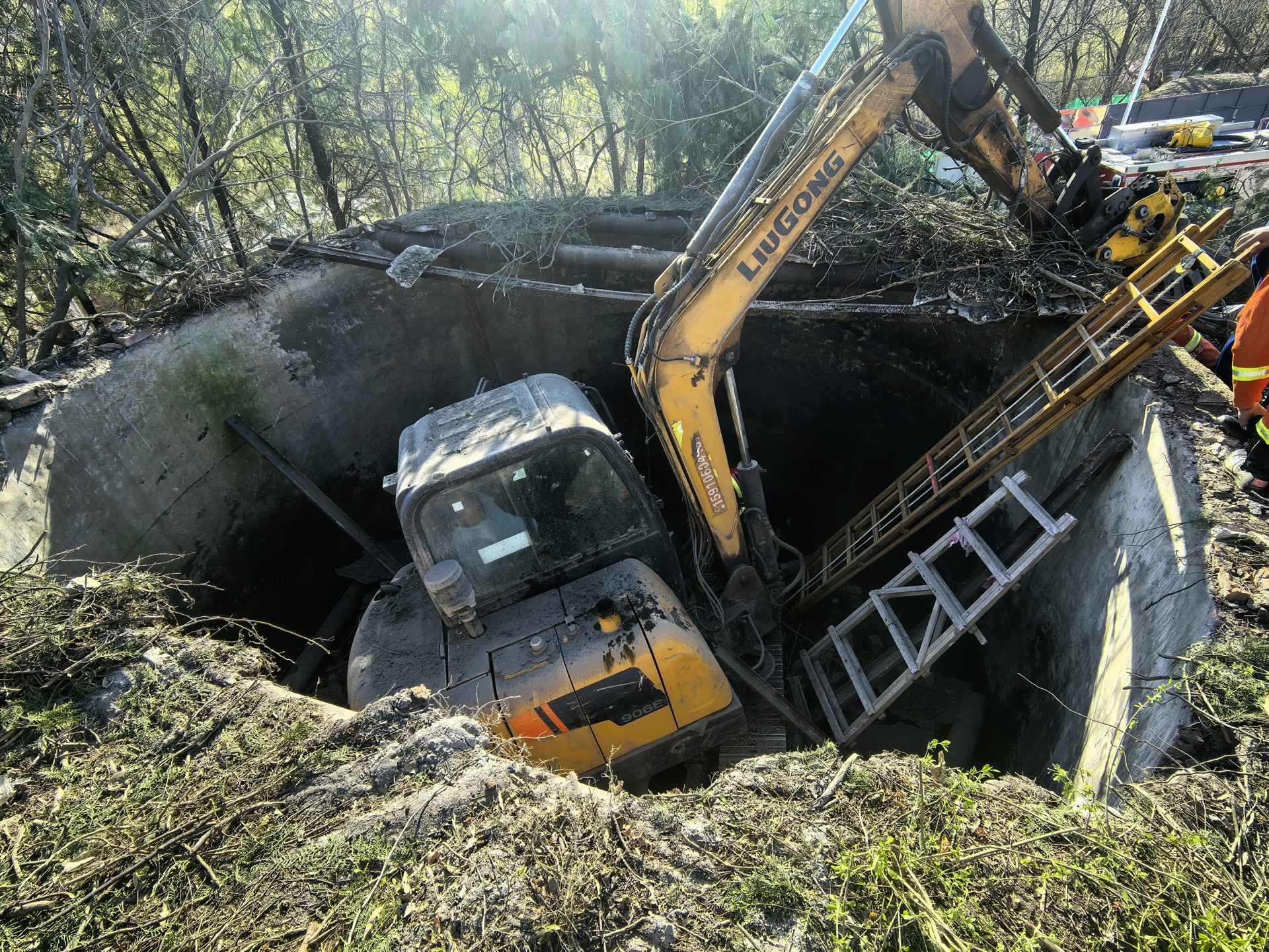 紧急出警的雁栖消防站队员赶到事发地——怀柔镇一处扩建工地时,看到“吞掉”挖掘机的井深约3.4米、直径约5米。进一步了解得知,被困司机当时正在驾驶挖掘机进行拔树作业,或许是对场地情况判断不足,挖掘机突然失去平衡,连带着他一同跌入旁边的大井。跌落瞬间的冲击导致司机腰部受伤,疼得根本无法动弹。