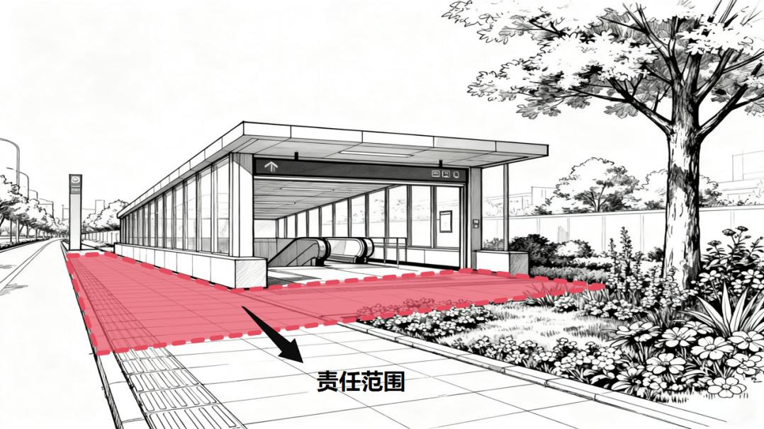 按照新规,轨道交通经营管理单位,负责轨道交通出入口建筑物、构筑物外侧墙体向外延伸一定范围,以用地红线为基准。此次征求意见的导则进一步对地铁“门前三包”的责任范围进行细分。其中,有人行道的,负责轨道交通出入口建筑物、构筑物外侧墙体向外延伸至人行道路缘石区域。有毗邻建筑物、构筑物或绿化带的,负责轨道交通出入口建筑物、构筑物外侧墙体向外延伸至毗邻建筑物、构筑物或绿化带外侧。不过,轨道交通出入口如果设在商场内、地下通道的,则不在“门前三包”责任制管理范围内。