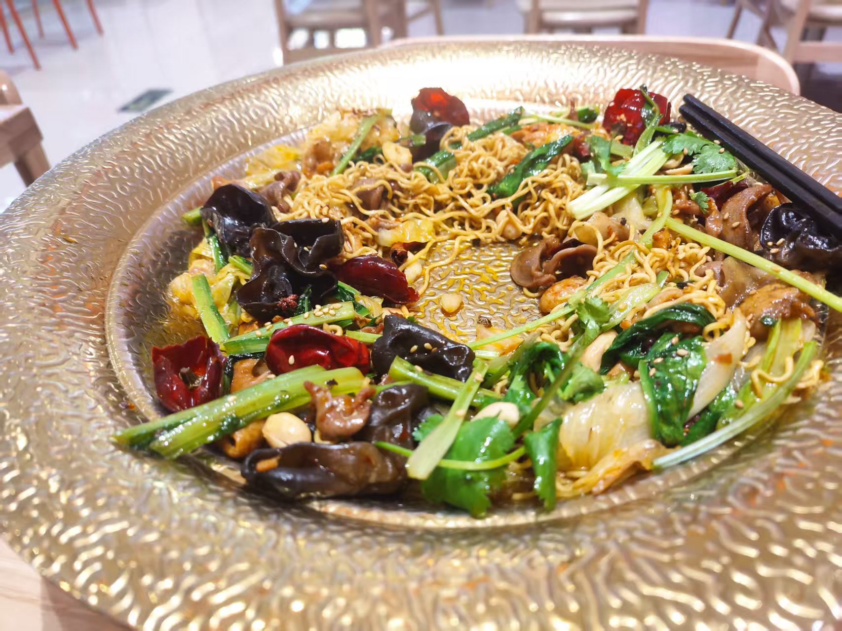 不一会儿,服务员端上来一个又大又圆的金色餐盘,将餐盘放在餐桌上的红色炉座上。看上去炉座是用来给餐盘持续加热的,但目前店内并没有提供加热服务,餐桌上的炉座只起到一个支撑的作用,倒是让餐盘在视觉上显得更高了。