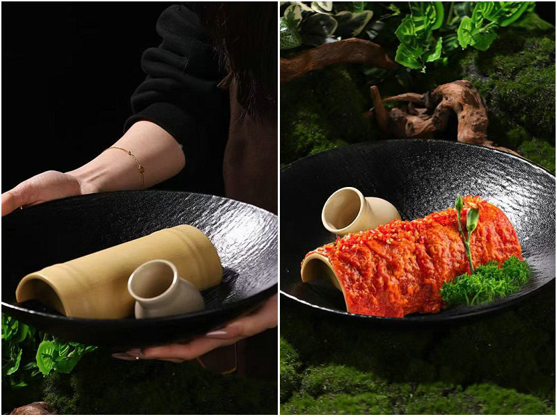 有一种山野火锅风格的九秒牛肉专用盘,由三个部分组成:深色的宽口窄底大盘,竹筒形状的内衬,瓦罐形状的干冰壶。上菜时,牛肉切薄片铺在竹筒内衬上,干冰壶内的干冰不断制造仙气飘飘的效果,在深色大盘和绿叶点缀的综合作用下,牛肉鲜艳亮眼,颜值飙升。