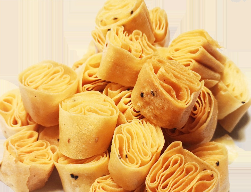 这小小咯吱盒儿的制作工艺,更是凝聚着古人匠人的匠心,核心分为三道工序,每一步都围绕“脆、香、耐存”展开。王陆昕介绍,“第一道工序是摊咯吱皮,这是最考验功力的一步。原料选用麦、米、豆、谷等杂粮,讲究的匠人会用纯绿豆磨粉,调水成浆后,用马勺在烧热的铁锅或柴锅上摊制。手腕要灵活,才能摊出形如满月、薄如蝉翼的咯吱皮。”