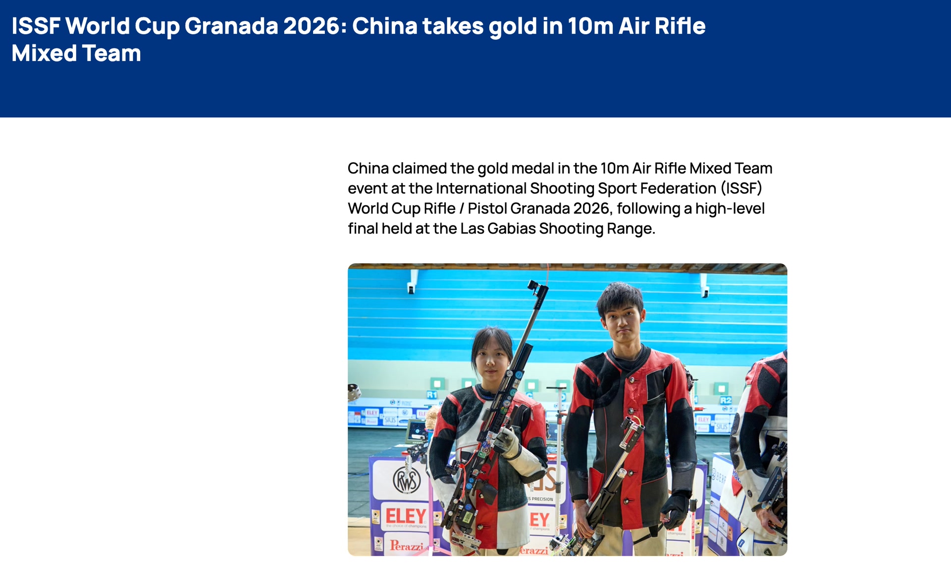 北京时间4月7日,在2026年国际射联射击世界杯西班牙格拉纳达站比赛中,中国组合王子菲/盛李豪夺得10米气步枪混合团体冠军,姚千寻/胡凯摘得10米气手枪混合团体银牌。