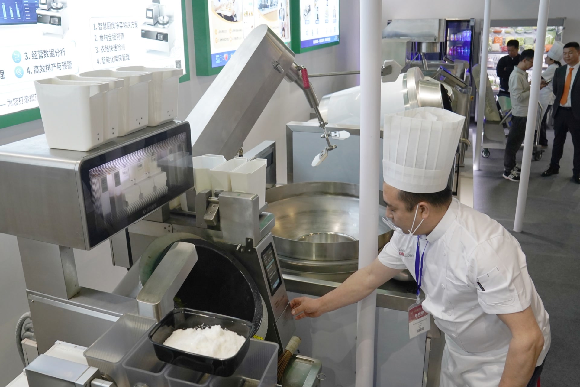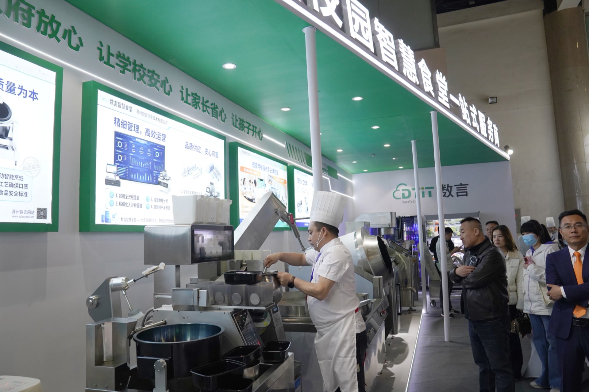 番茄菜花、宫保鸡丁、香菇油菜……操作者只需按下“立即烹饪”按钮,便可静待美味大餐的出炉。展会现场,校园智慧食堂的炒菜机器人吸引不少人围观。“系统能根据不同菜系自动调节火力大小,自动精准添加酱油、醋等调味料。”工作人员介绍,包括炒菜机器人在内的整套校园智慧食堂一站式解决方案,可以从源头保障食品安全,还能通过智能结算台、人脸识别等技术,全面提升食堂运营效率。
