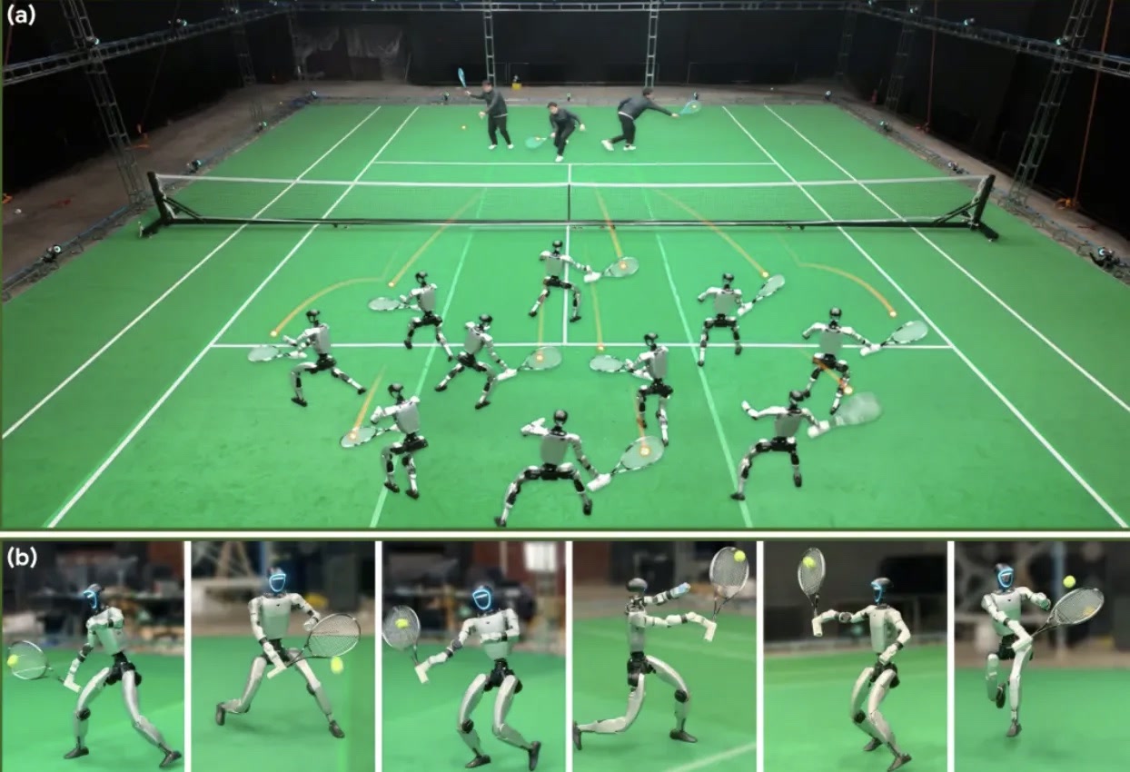 网球运动堪称人形机器人的“终极考场”。运动员往往需要以每秒数米的速度在球场上来回奔跑,对时速几十公里的来球做出反应,并在几毫秒的球拍接触时间内完成击球。传统人形机器人受限于预编程模式和对高质量动作捕捉数据的依赖,难以应对如此随机、多变的对抗环境。