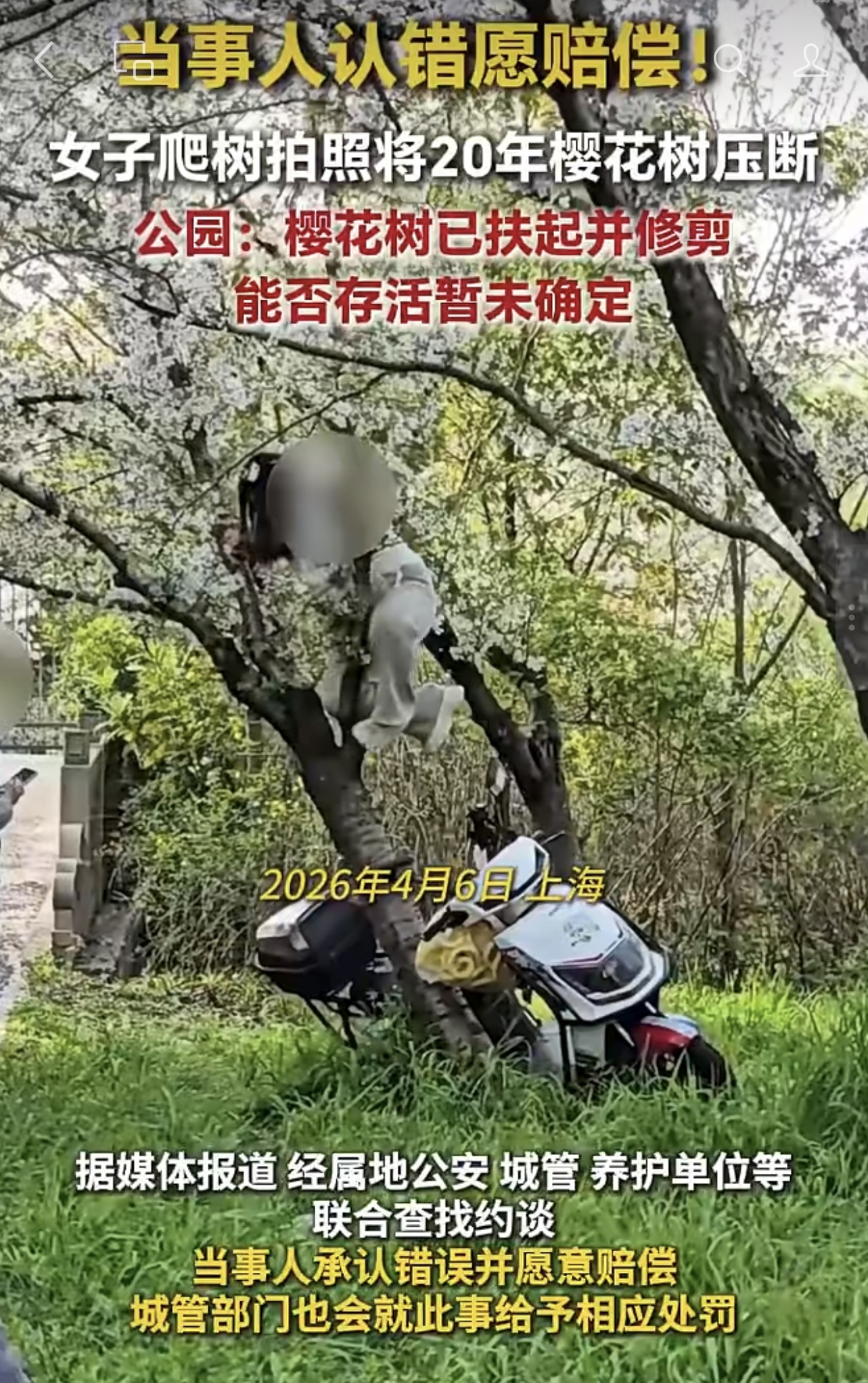 近日,有游客在上海宝山区顾村公园爬上一棵有20余年树龄的樱花树,活活把樱花树给压倒了。公园管理方虽及时扶正并修剪树木,但树木能否存活尚不确定。经属地公安、城管、养护单位等联合查找约谈,当事人承认错误并愿意赔偿。这棵树从幼苗到枝繁叶茂用了20年;而毁掉它,只需要一瞬间。春和景明,樱花烂漫,本是赏心乐事。可总有人,为一己拍照之乐,无视公共规则与公序良俗。草木有情,一花一树皆是城市公共福祉。处罚与赔偿是对不文明行为的惩处,更应成为全社会的文明警示。