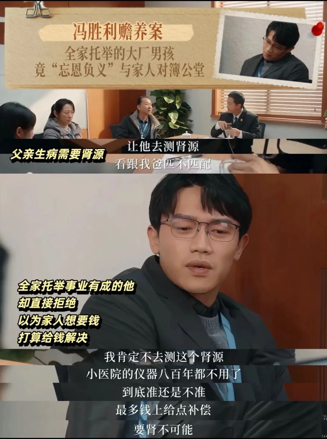 冯连山病重起诉儿子要赡养费,儿子让律师签调解协议同意支付,但要求以后别再联系。沈谢秩法官追查发现,儿子隐瞒了尿毒症病情,变卖房产为父治病,而父亲起诉只为确认儿子的真实情况。最终,在法庭调解下,儿子承诺配合治疗。