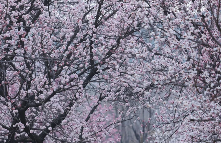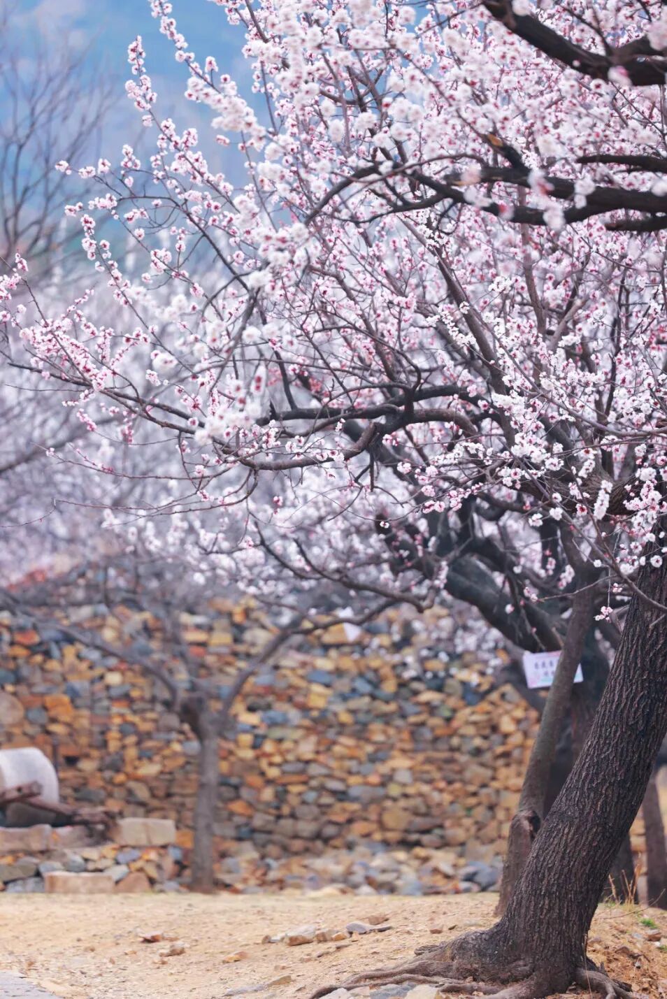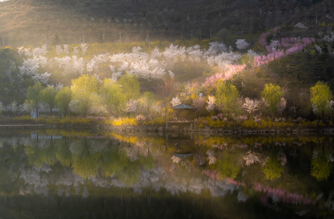 龙廷镇的掌平洼村也是踏青的宝藏地。千亩杏梅花漫山盛放,环抱古朴的石砌老屋与网红蟠龙古井,花海、古村、老井相映成画,宛如世外桃源。