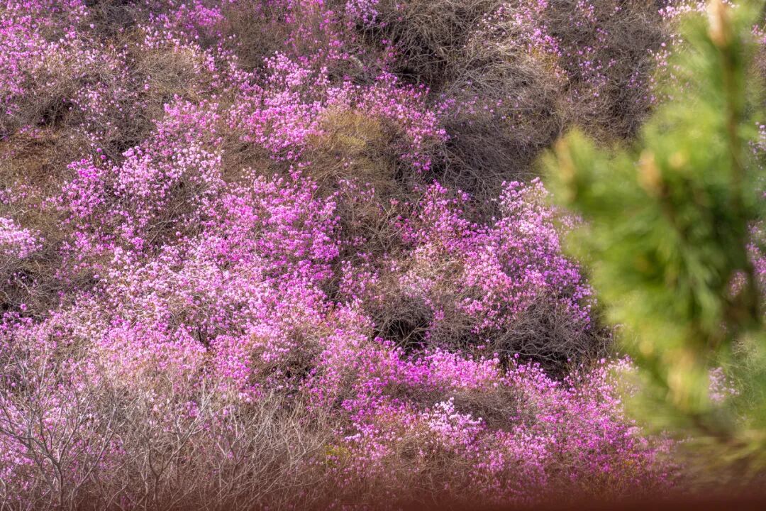 五莲山·九仙山上,漫山遍野的杜鹃花开得如火如荼,粉紫相间,映衬着奇山怪石,仙气十足。