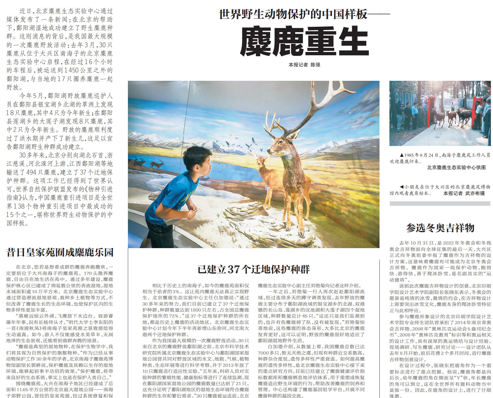呦呦鹿鸣,食野之苹。世界自然保护联盟发布的《物种引进指南》认为,中国麋鹿重引进项目是全世界138个物种重引进项目中最成功的15个之一,堪称世界野生动物保护的“中国样板”。而南海子麋鹿苑的成功范例,也标志着北京在生物多样性方面作出了卓越贡献。