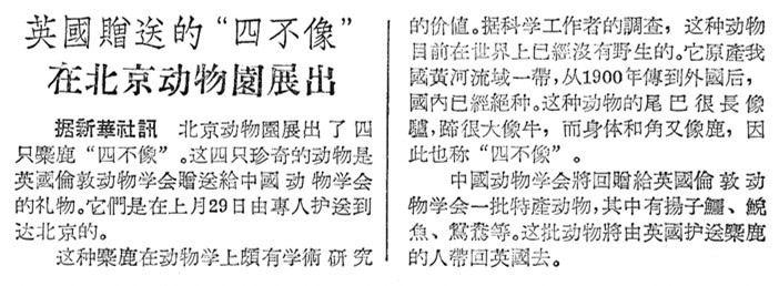 1956年,北京动物园迎来了4只麋鹿,这是英国伦敦动物学会赠送的珍贵礼物。(1956年5月4日《北京日报》2版,《英国赠送的“四不像”在北京动物园展出》)为了发展中英两国人民的友谊,1973年,英国又赠送了两对麋鹿,同样放在北京动物园饲养。麋鹿在北京动物园展出后,引起游客极大兴趣,本报曾专门发表文章,为读者介绍麋鹿的历史。(1963年4月18日《北京日报》3版,《北京的“四不像”》)