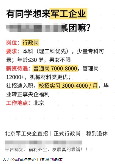 “XXX招人,企业编制太香了!”“XXXX集团,内推优先安排”“XXXX集团,央企直签招人”……一家人力资源公司账号的主页上,不乏央企国企工作岗位信息。这些信息,不仅标注出具体岗位、薪资待遇、相关要求,更用诸如“先到先得”“入职即签订正式劳动合同”“1周面试,3到5天上岗”等字眼诱惑用户。