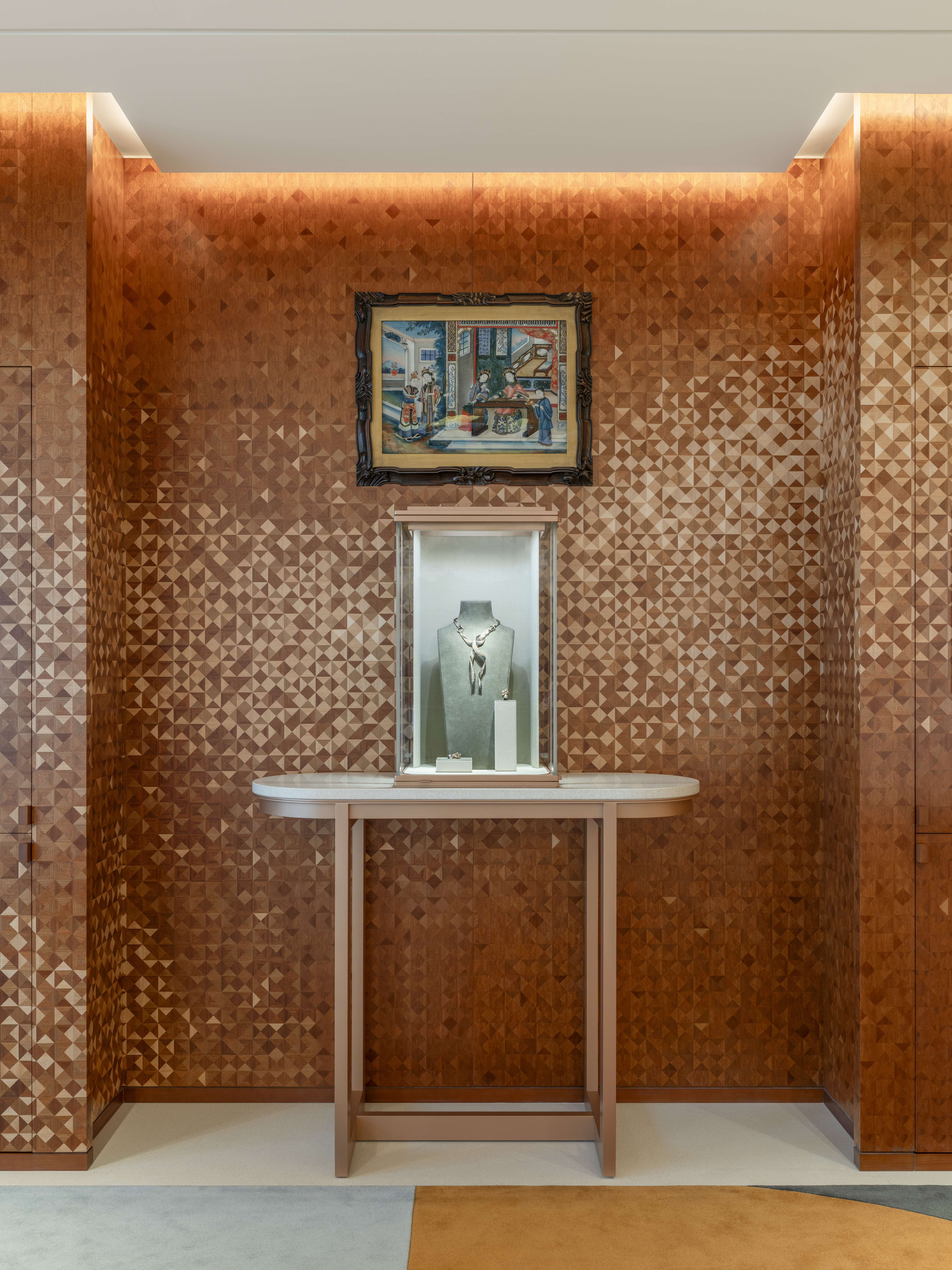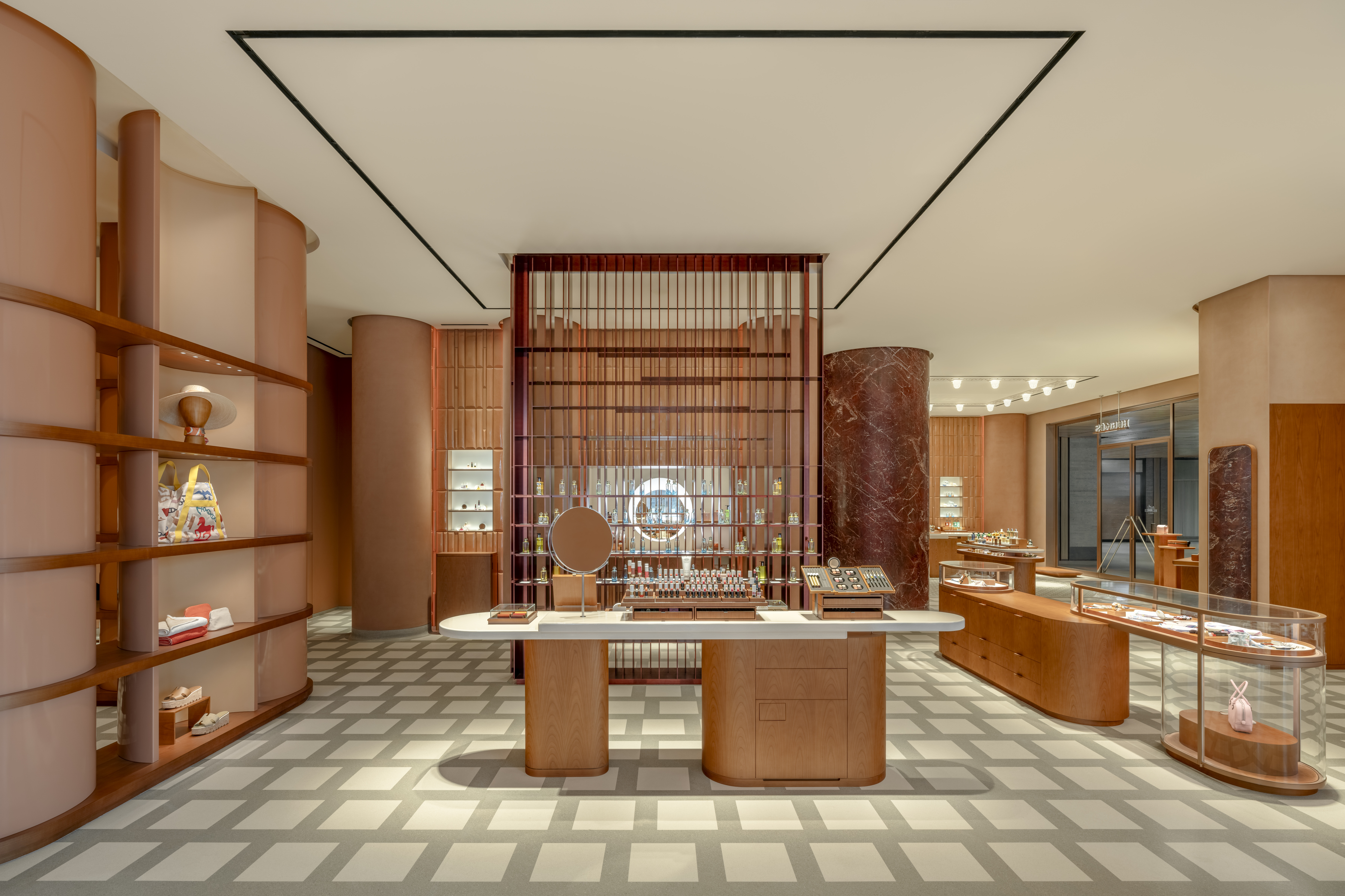 再往上,三层空间内,竹木镶嵌、彩色漆面瓷砖与呈H形铺展的陶瓷砖墙交相辉映,家居系列、皮具、腕表及珠宝于此静静陈列。