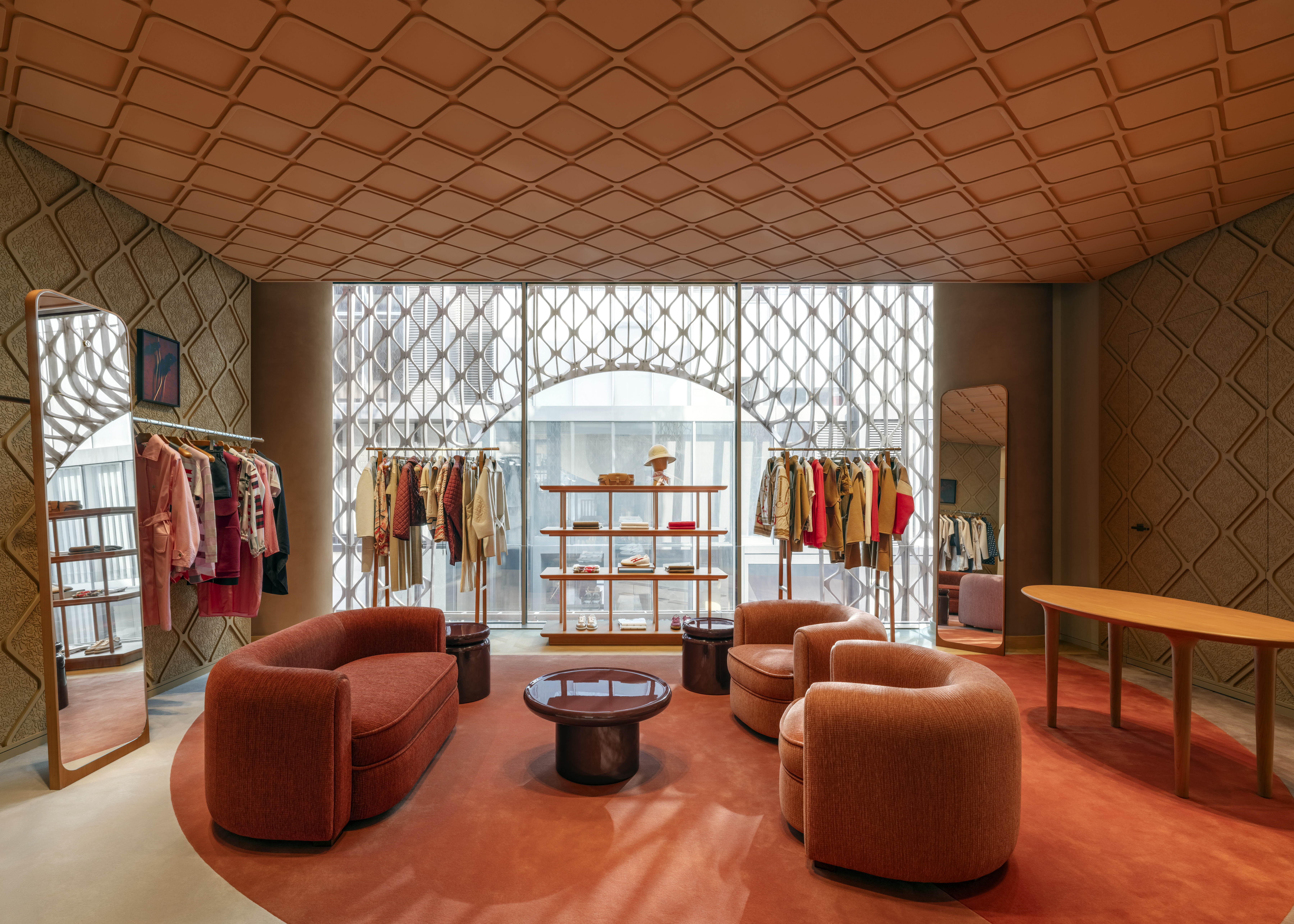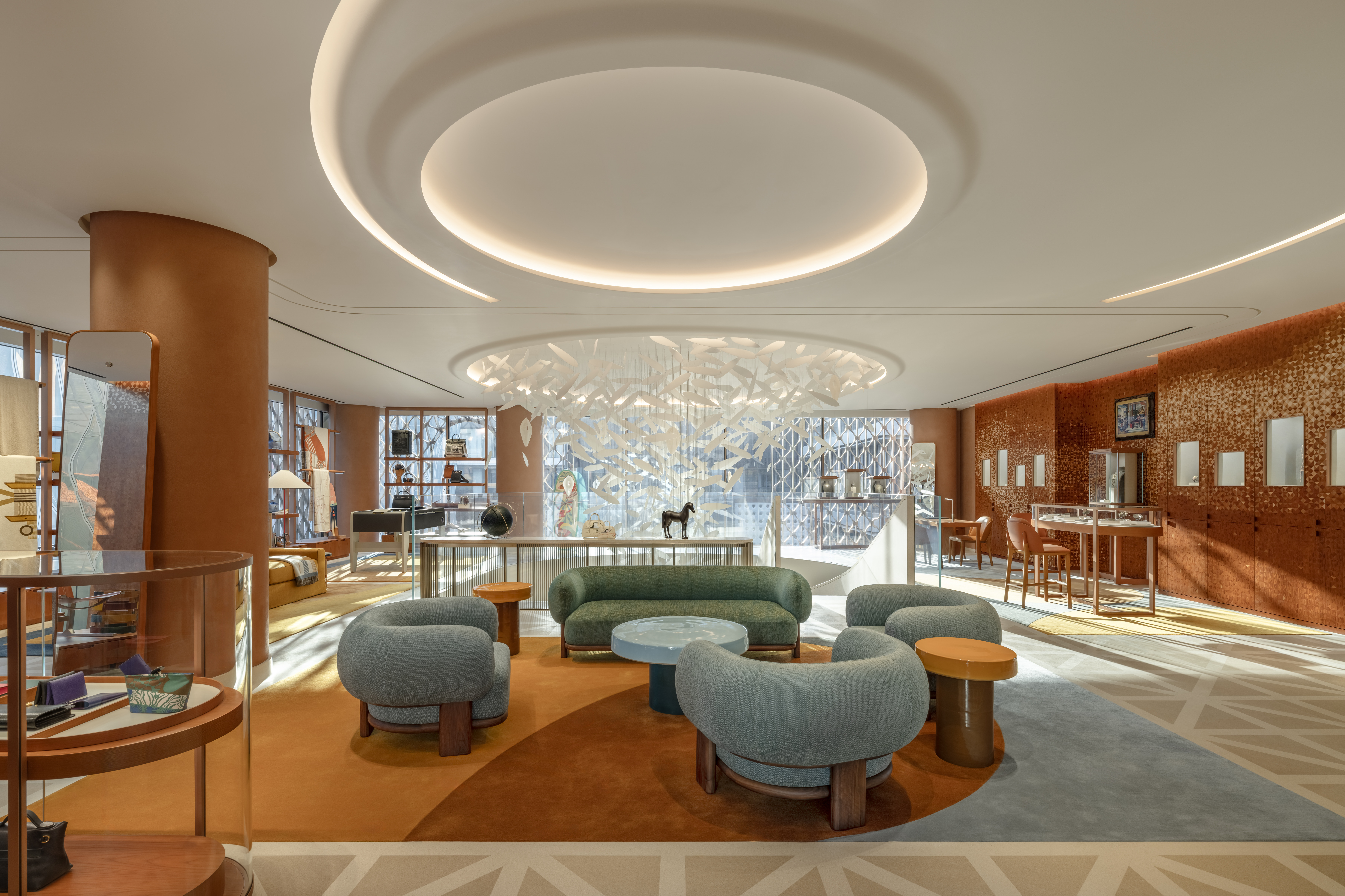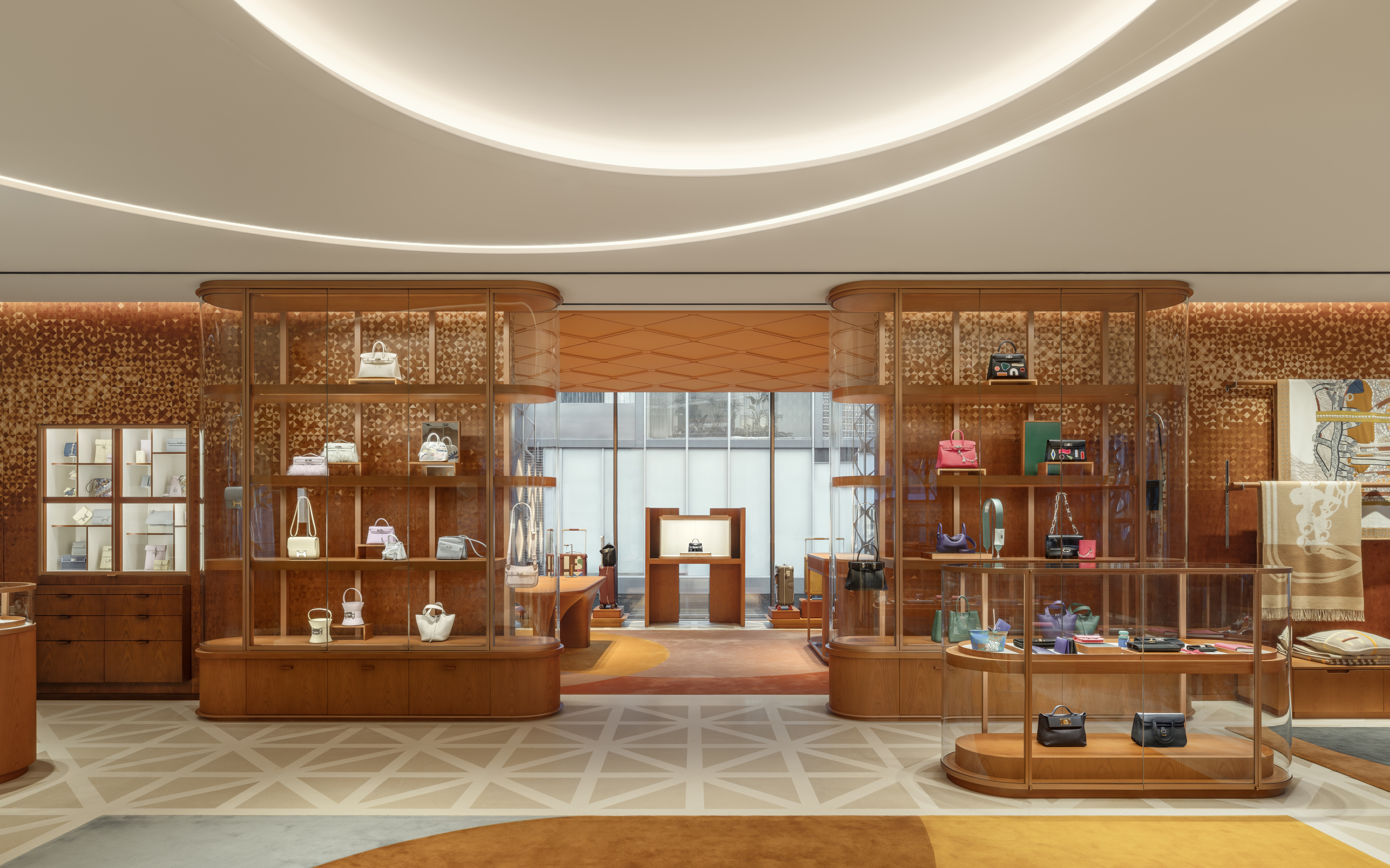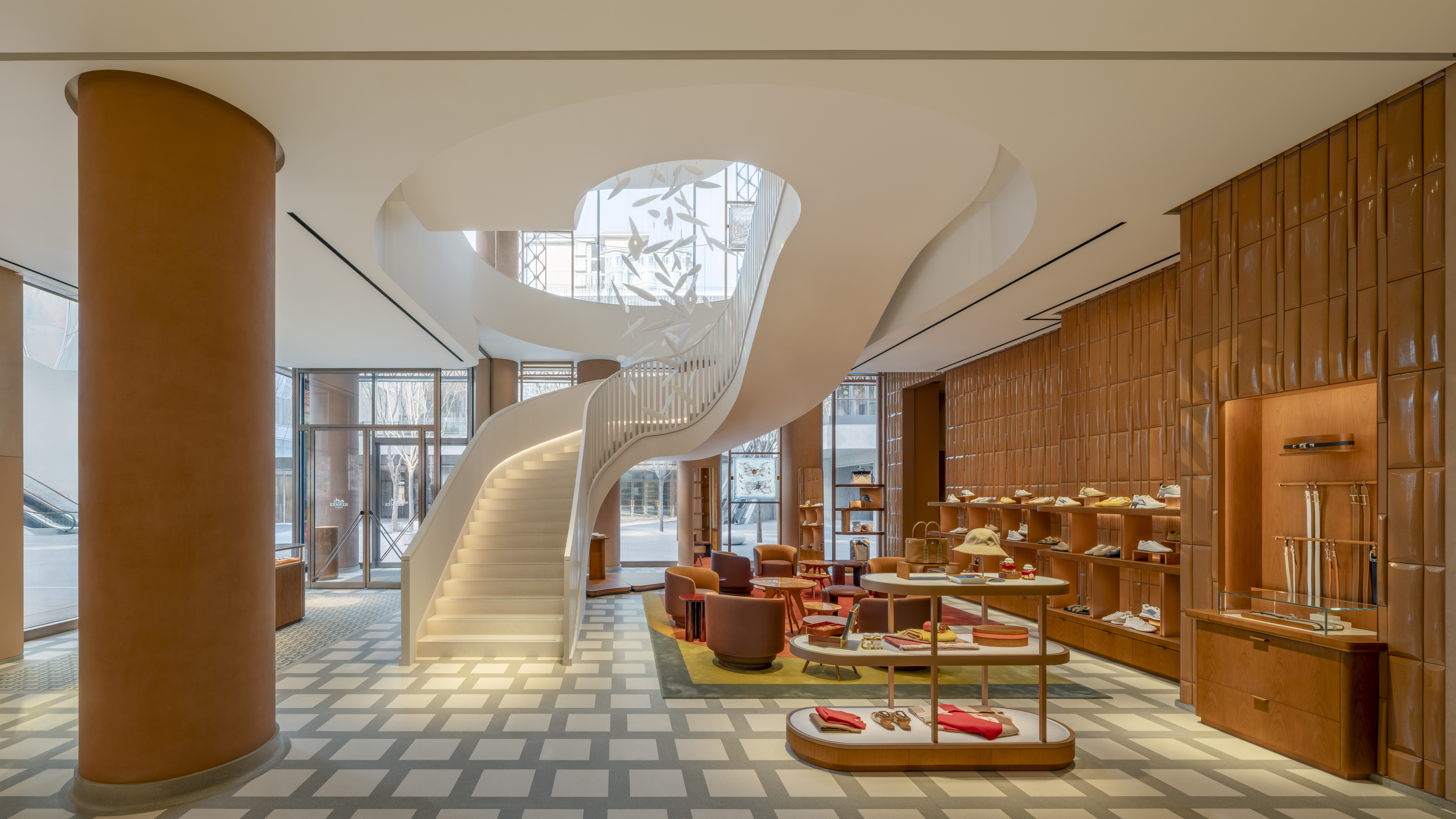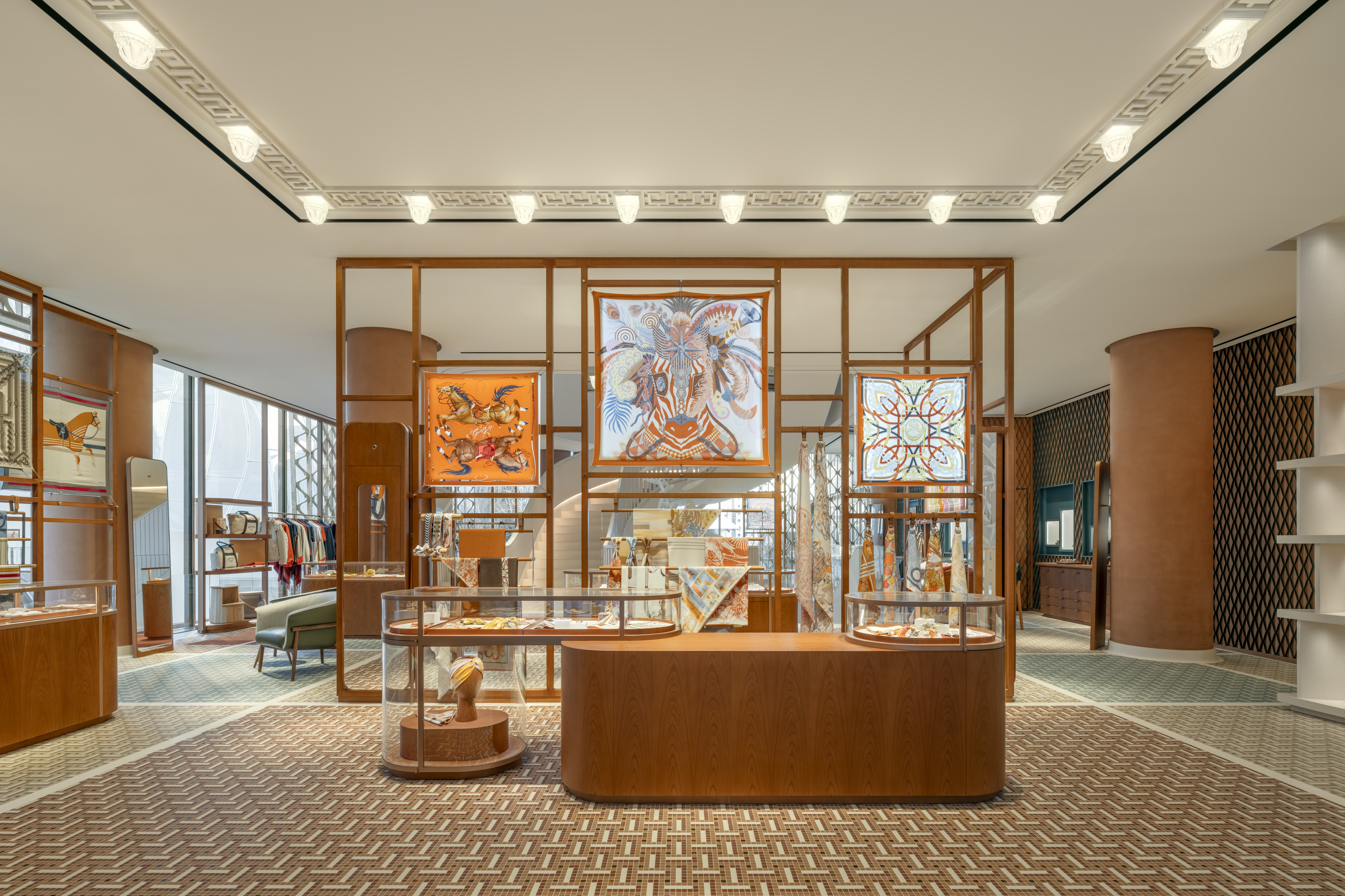 设计致敬了紫禁城殿宇建筑,凹形琉璃瓦屋脊、暖阳色调与材质的层次感,皆与爱马仕美学风格彼此呼应。