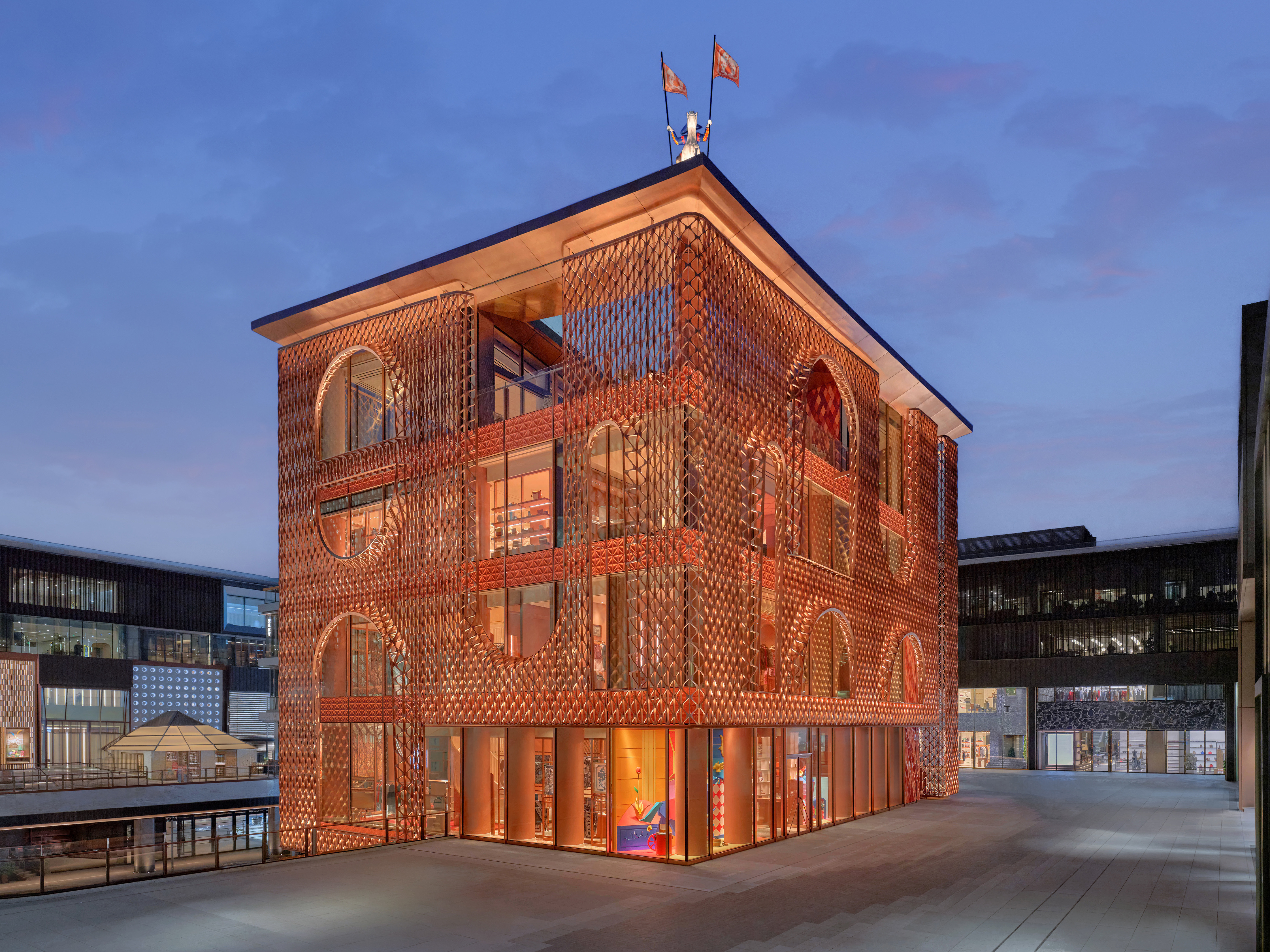 建筑外观由巴黎建筑事务所RDAI与Mamou-ManiArchitects合作设计, 铜色网状结构包裹之下,宛如精致的鸟笼,亦似半透明纱幕,在朦胧与通透间取得精妙平衡。日间,自然光线得以透过立面柔和照亮室内。
