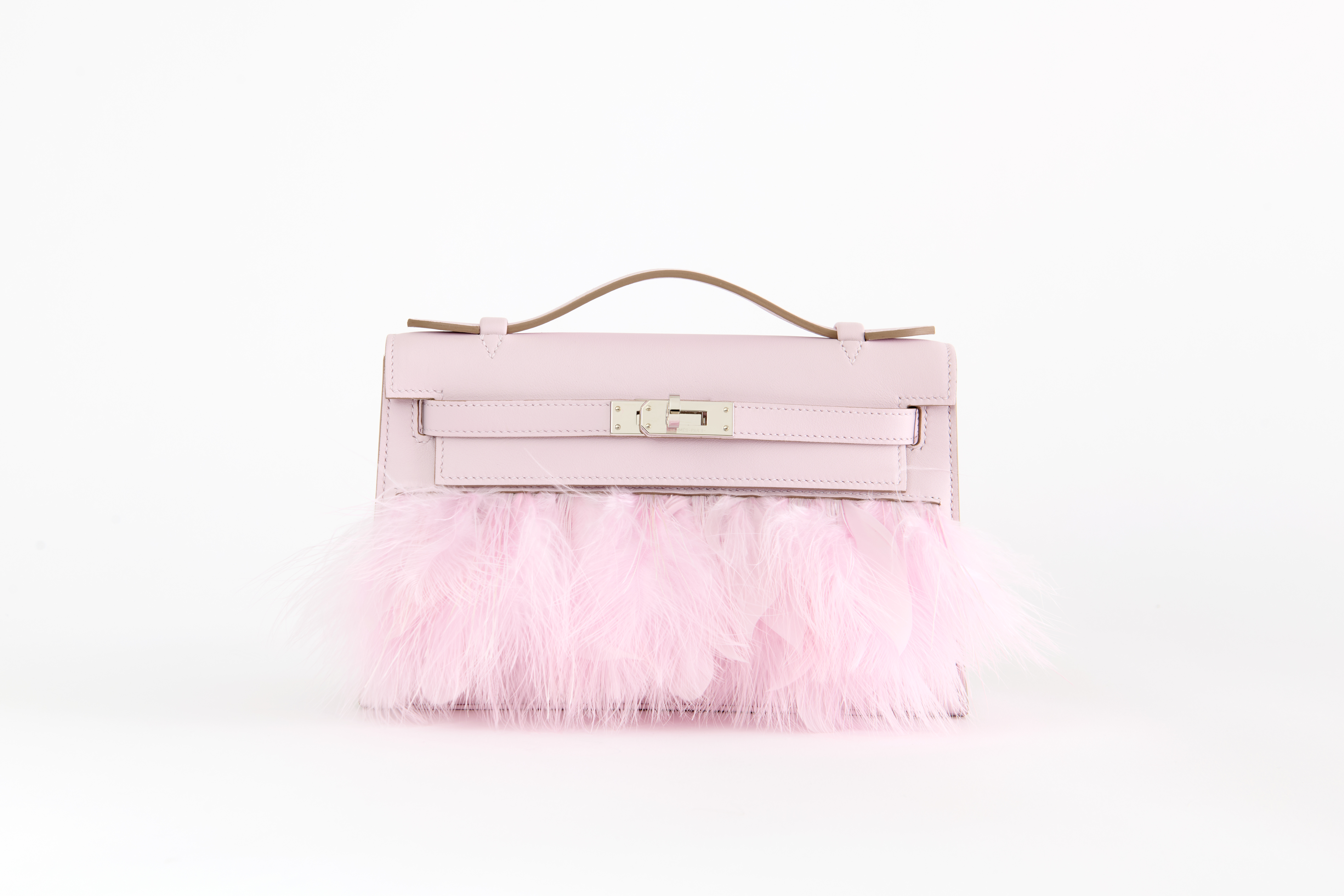 承袭 Kelly Elan的成熟工艺,首次将羽毛工艺融入其中。 精选4种羽毛, 包括公鸡羽毛, 火鸡羽毛, 驼鸟毛以及鹅毛, 以特殊工艺拼贴于SWIFT小牛头皮之上, 每一根都经专属染色,与皮革色泽呼应, 让轻盈羽毛与利落皮革和谐中尽显优雅浪漫, 彰显爱马仕皮具匠艺。
