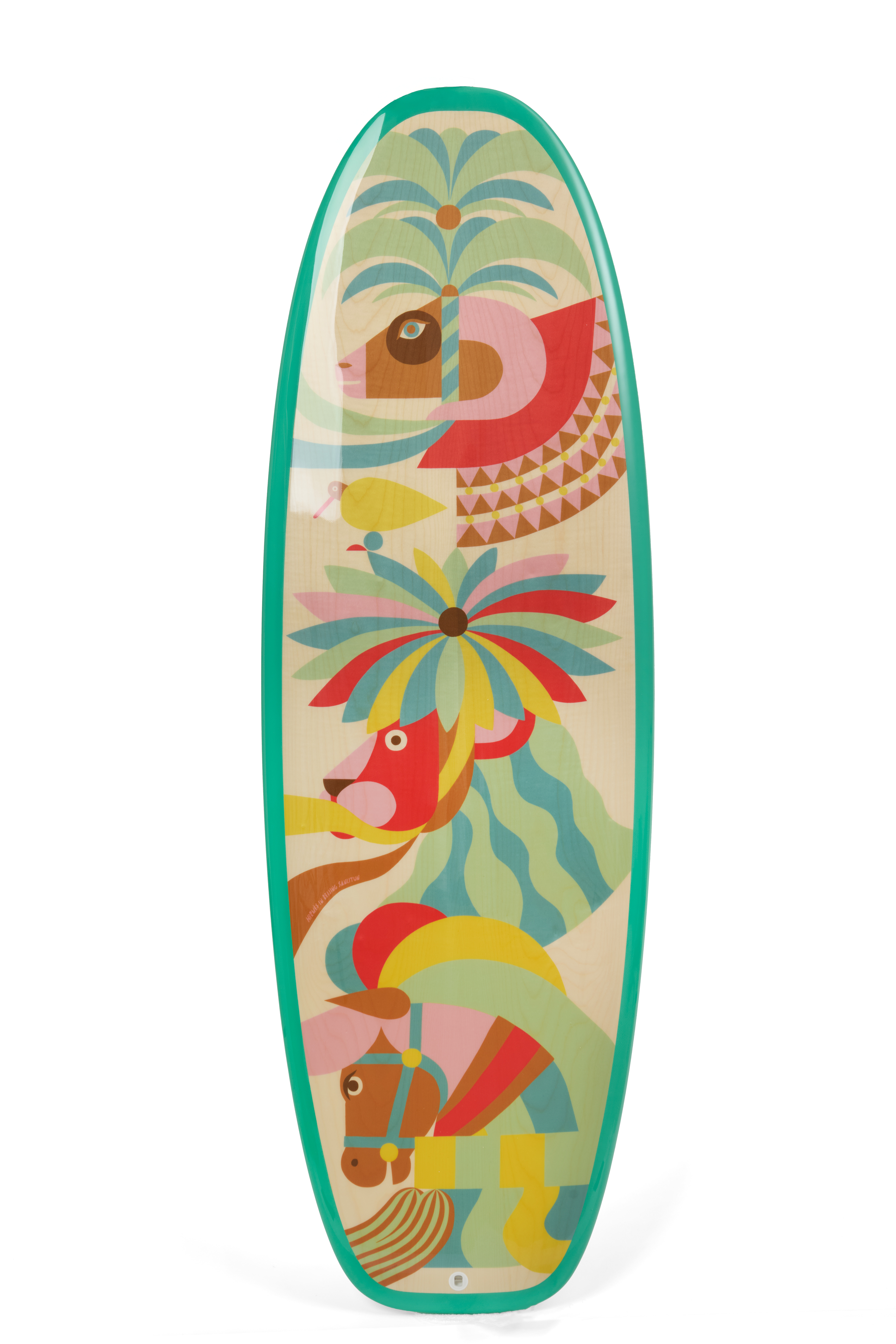 来自爱马仕特别定制部门, 桨板上的图案为艺术家任通创作的丝巾图案——盛大游行。 冲浪板内部为泡沫块, 正面覆盖梧桐枫木贴面, 背面 (底座)覆盖着色树脂。木鳍单件加工。 不锈钢安全绳扣的灵感源自锚链。