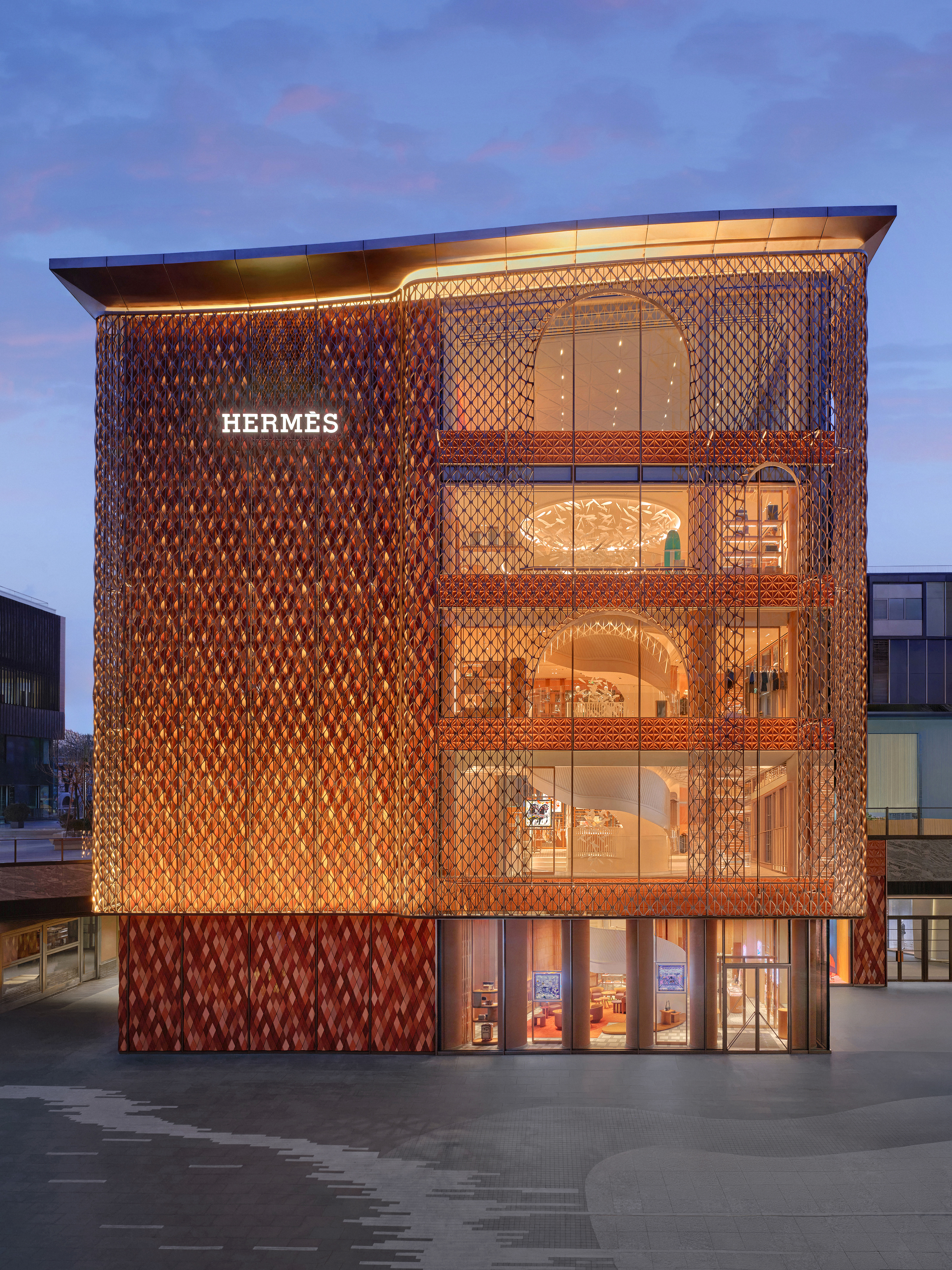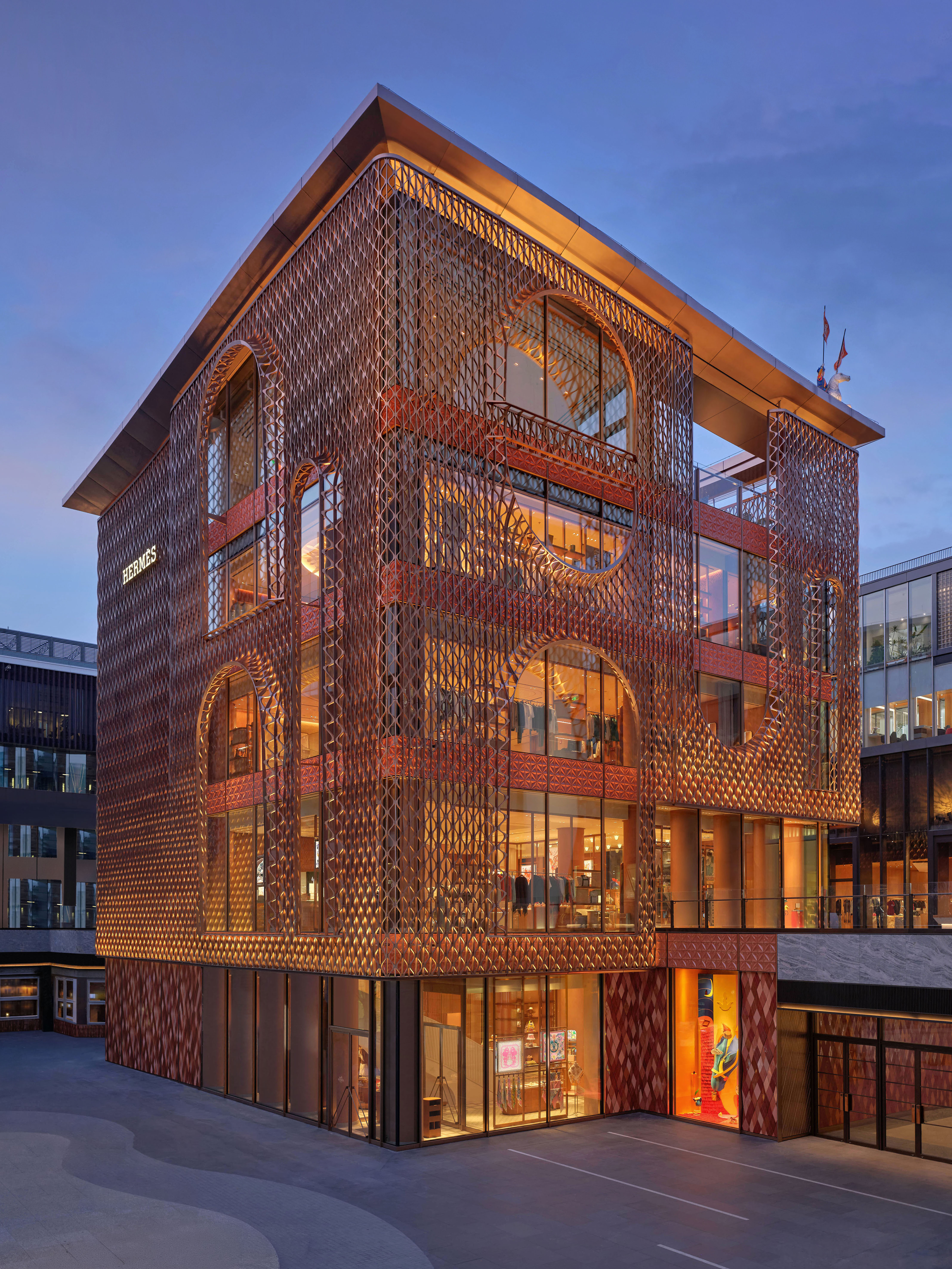 全新爱马仕专卖店坐落于开放式购物中心,以鲜明建筑形态自成一道景致。 五层玻璃幕墙外覆玫瑰粉与赤褐色陶瓷砖,经由表面细腻的凹槽纹理,捕捉亦辉映都市流光。