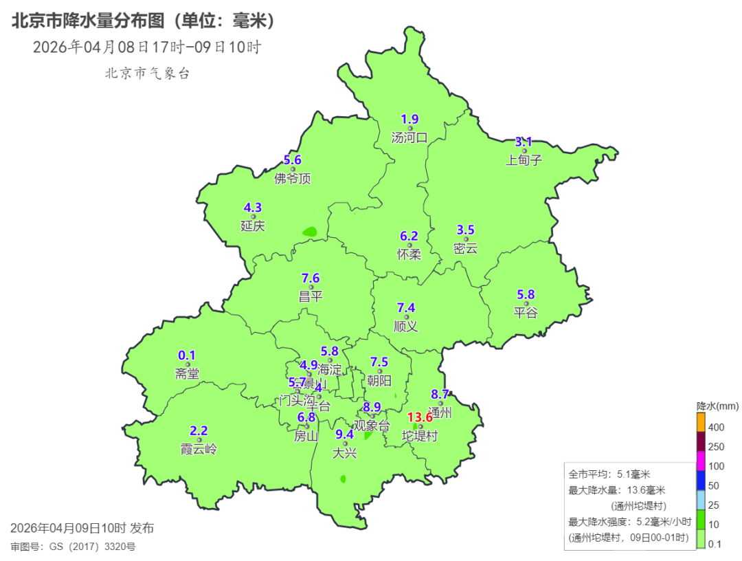 8日17时至9日10时降水量(毫米):全市平均5.1,城区平均(朝,海,丰,石,东,西)5.5,东南(通,大)8.5,西北(延,昌)4.9,东北(密,顺,平,怀)4.8,西南(门,房)3.4;城区最大朝阳三间房11.4,全市最大通州坨堤村13.6,最大小时降水强度通州坨堤村5.2毫米/小时(9日0时-01时)。