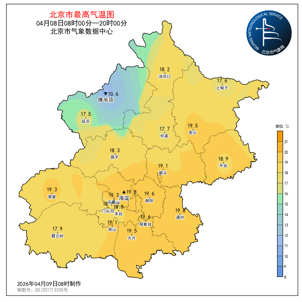 4月8日08时至4月9日08时,观象台最高气温19.6℃(14:05),最低气温10.1℃(07:20)。