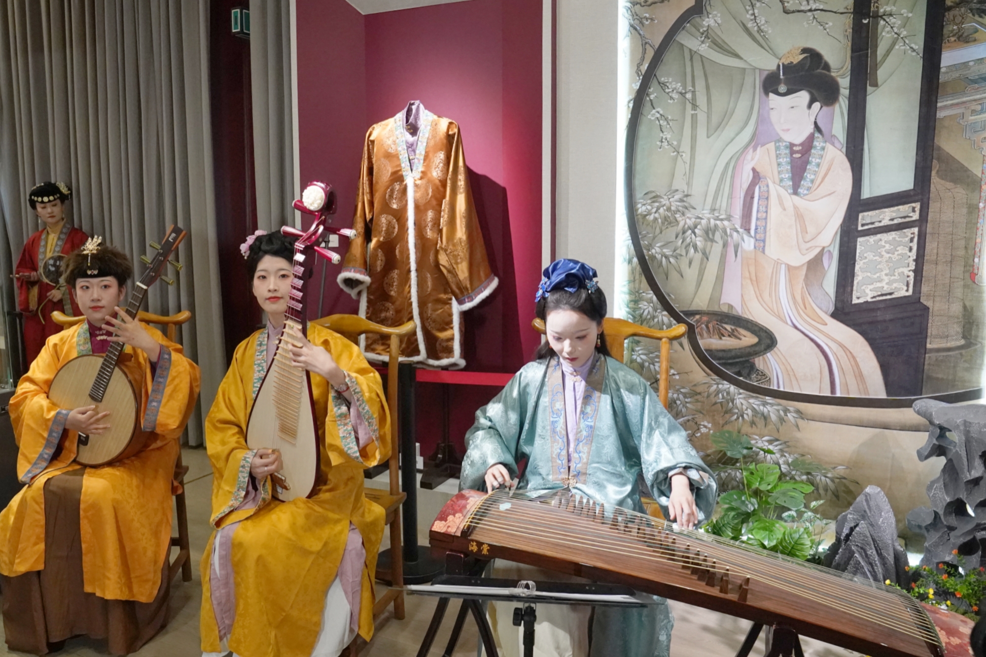 同时,“屏影惊鸿 —— 雍正十二美人图岁时雅韵展”也在圆明园博物馆最上楼二层正式开展。《胤禛十二美人图》原陈设于圆明园深柳读书堂围屏,画中女子品茶、观书、赏蝶、对镜,衣饰纹样精巧绝伦,暗八仙、缠枝莲、福寿纹等尽显皇家工艺之美。本次展览1:1 非遗复原美人服饰与配饰,历时半年考据复刻,还原画中衣纹、发饰、首饰细节,点翠步摇、福寿发簪、莲花耳饰等十余件复刻首饰同步展出,让观众近距离感受清代宫廷美学的极致匠心。
