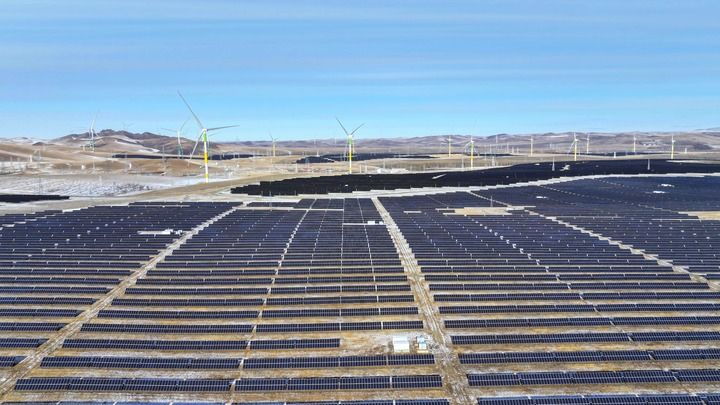 在内蒙古赤峰市,连绵起伏的山川间,百米高的白色风机呼啸转动,深色光伏板连成一片,源源不断地为远景赤峰零碳氢能产业园提供绿电。