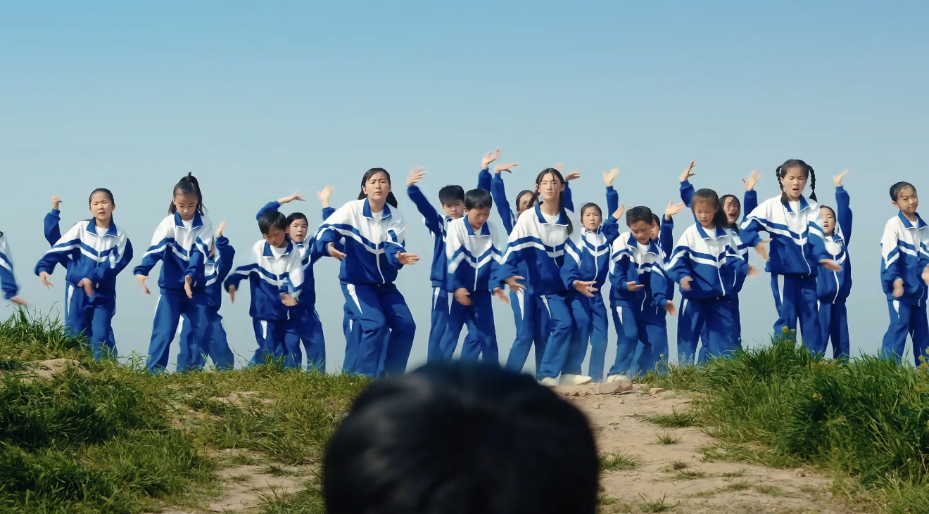 春天的麦苗刚刚返青,蓝天下的田埂暖意洋洋。一群孩子穿着蓝白校服,在《好春光》的音乐声中,一头扎进田间欢快起舞。手边的花儿就是表演道具,双脚踩着泥土自然踏响节拍……虽说动作不算专业整齐,表情管理全靠个人发挥,但每一步都透着恣意烂漫。短片中老师扮演的“大人”身着衬衫领带,紧抱公文包,看上去班味十足,而最终也在孩子们的邀请下“没心没肺”跳了起来。这一刻,我们仿佛能摸到大地的温度,生命力这个词也悄然具象化了。