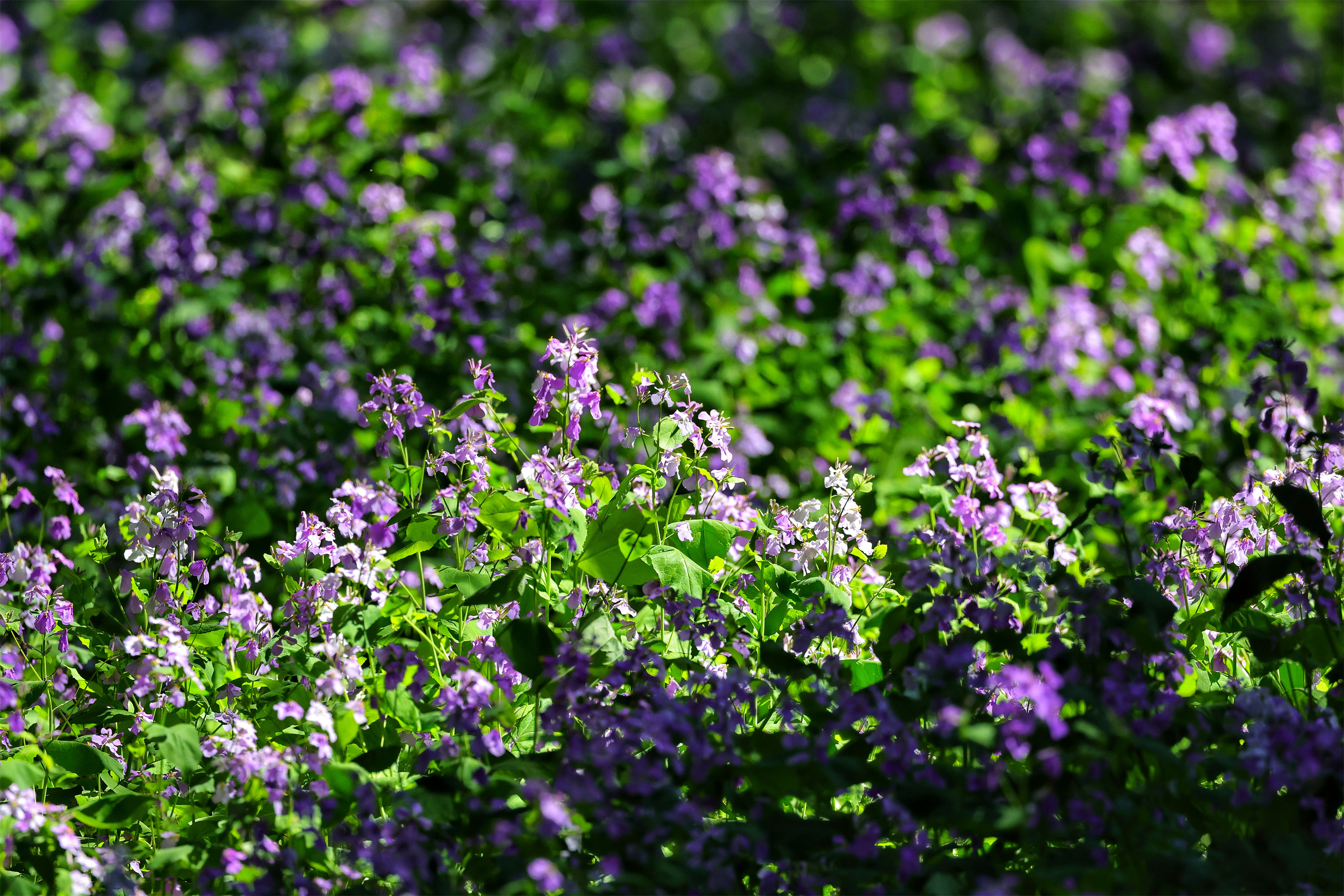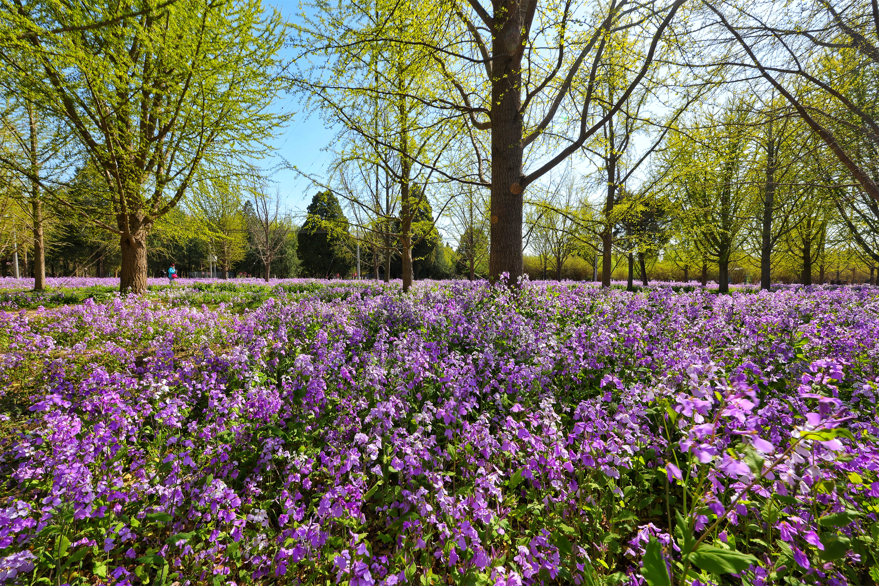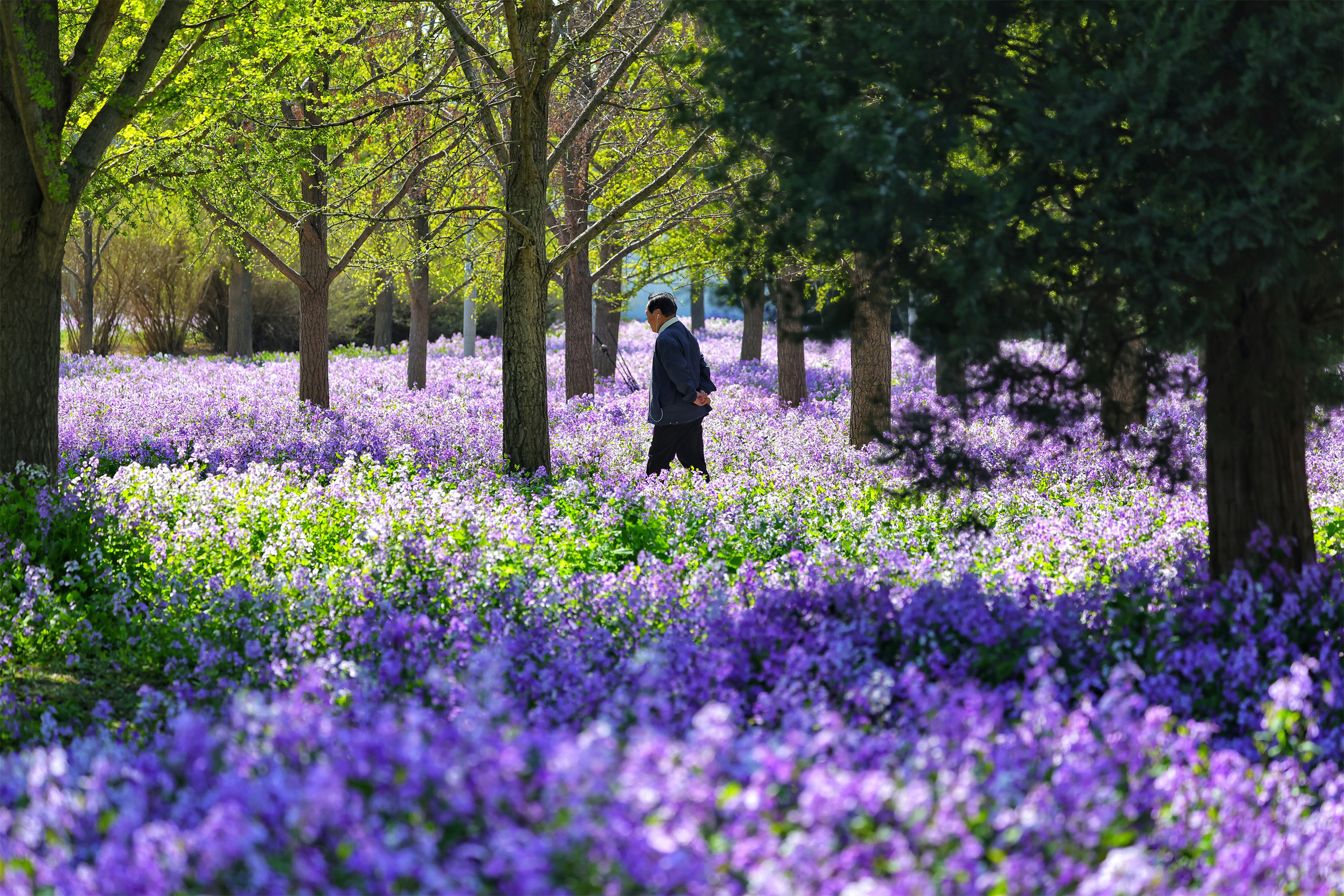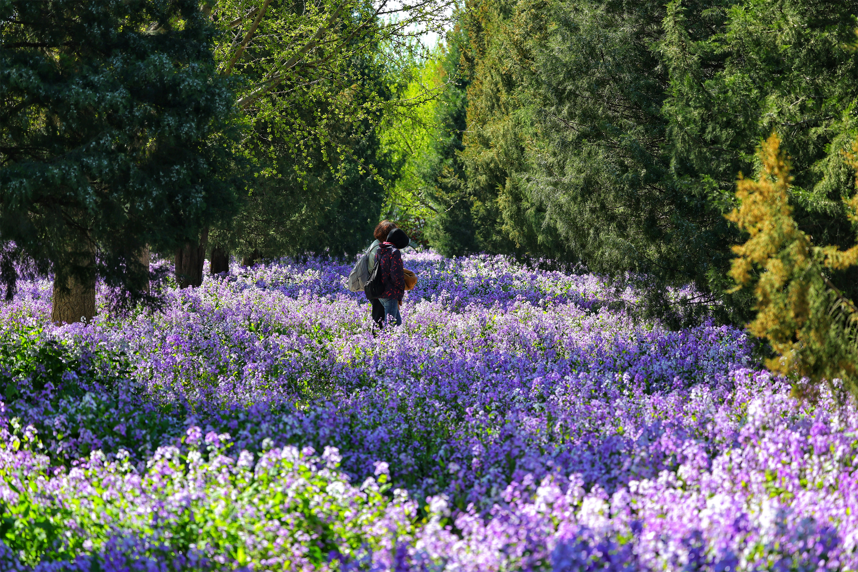 古柏林下的二月兰开成一片紫色的海,风一吹,花浪起伏,从林间一直涌向墙根下。