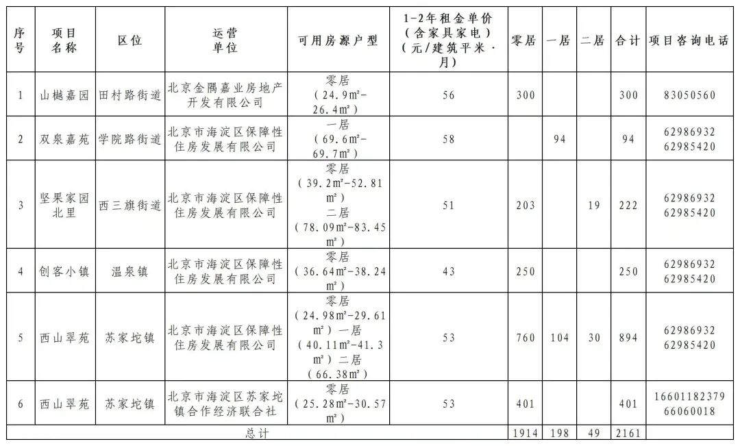 此次配租房源涉及6个项目,房源共计2161套。选房前,如有腾退等原因产生的房源可一并纳入上述配租房源,实际配租房源及相应户型信息以选房现场提供的展板为准。项目大致情况见下表: