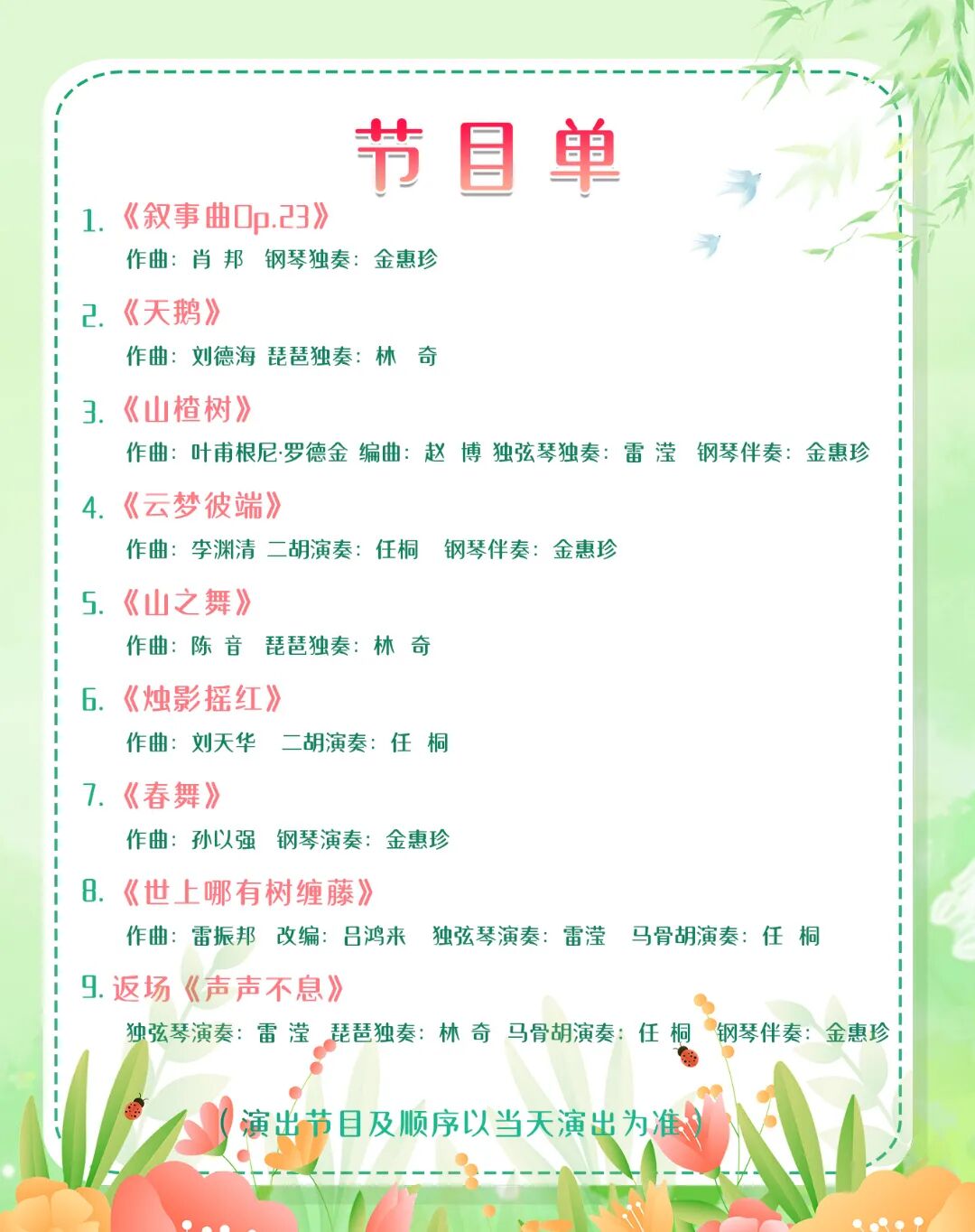 当春风吹绿枝头,万物在暖阳中苏醒,《人民的非遗——春之声音乐会》如期而至。钢琴的清澈、琵琶的灵动、二胡的深情、独弦琴的悠远,四种气质各异的乐器将在舞台上交替绽放。从琴键上的春潮涌动,到丝弦间的花开鸟鸣,中西乐器在此碰撞对话,带领听众在一场音乐会中穿越多元音乐风景,感受层次丰富的春之韵律。