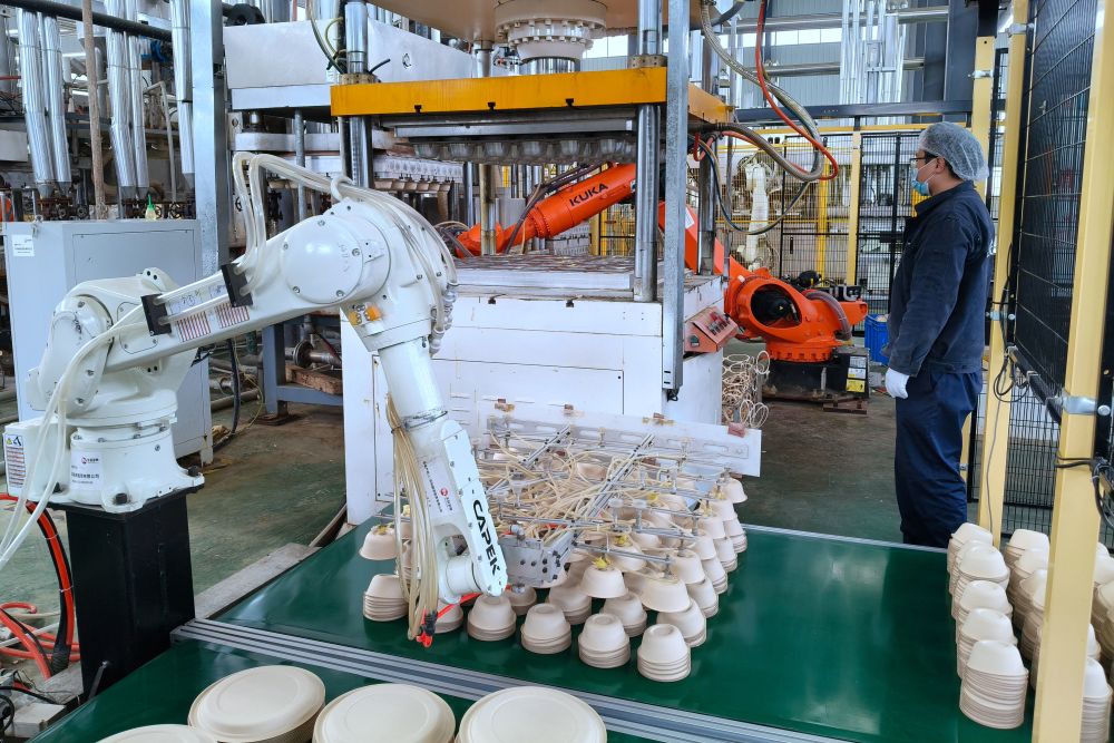 清晨七点,长江重庆忠县段的薄雾还未散尽,重庆瑞竹植物纤维制品有限公司的车间里已经机声隆隆。机械臂灵活地上下翻飞,一根根撑绿竹经过粗磨、精磨、模压等10余道工序,蜕变为抗高温、可冷冻、防水油的竹纤维餐盒。