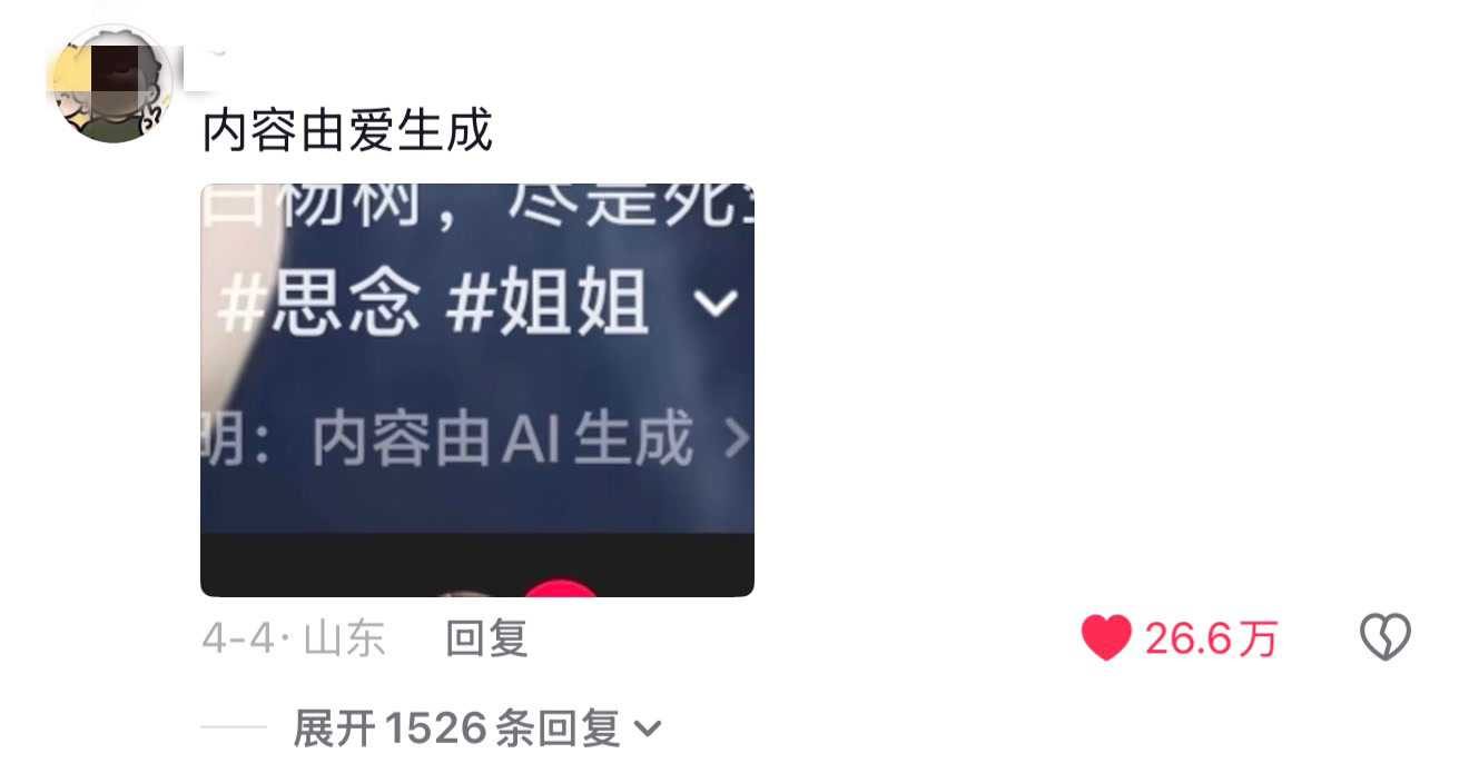 近日,在短视频平台,话题“这些视频由爱生成”登上热搜榜。起因是有博主借助最新AI视频技术,逼真重现网友逝去亲人的音容笑貌,而视频下方所标注的作者声明“内容由AI生成”,被网友引申为“内容由爱生成”,成为点赞量超26万的“神评”。