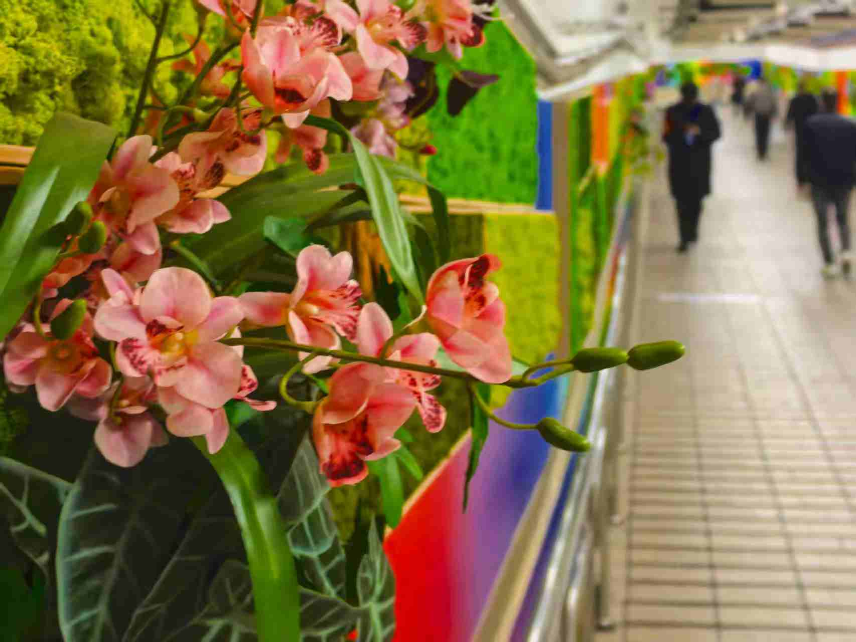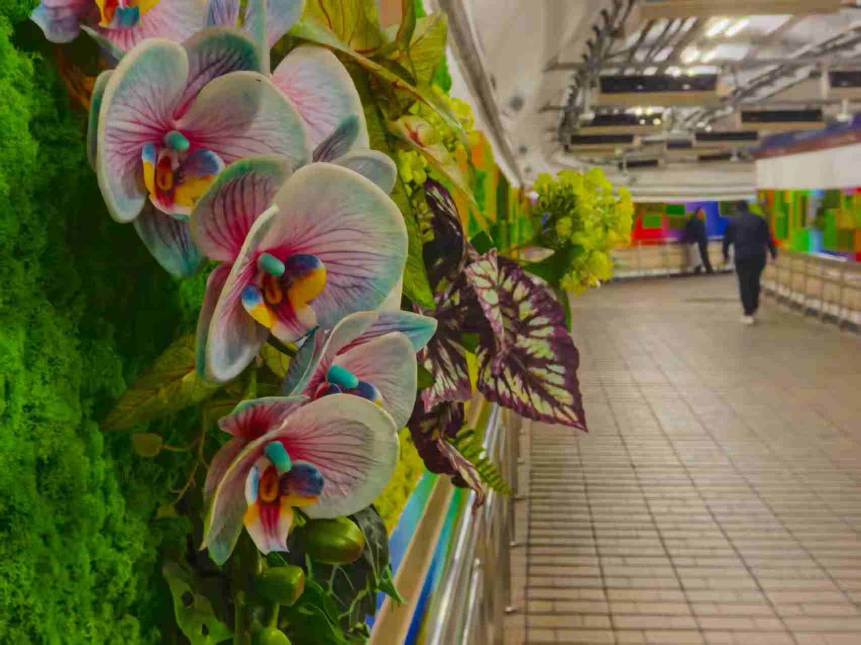 花乡鲜花绿植“入驻”复兴门地铁站1号线与2号线地铁换乘隧道内,地铁隧道花香四溢,鲜花绿植造型时尚,魅力多姿。