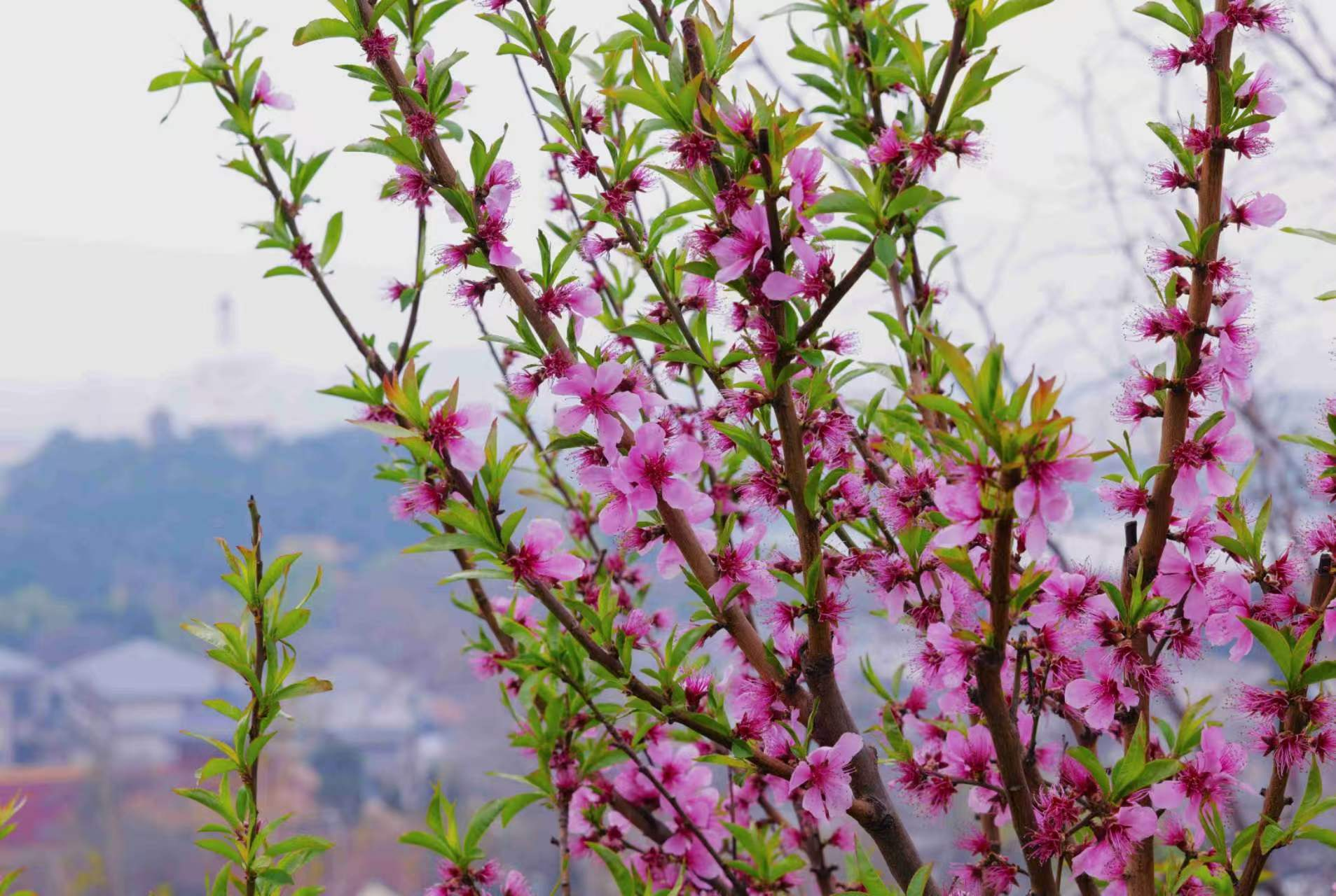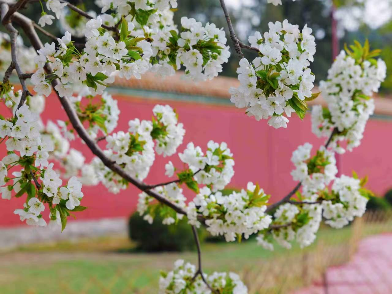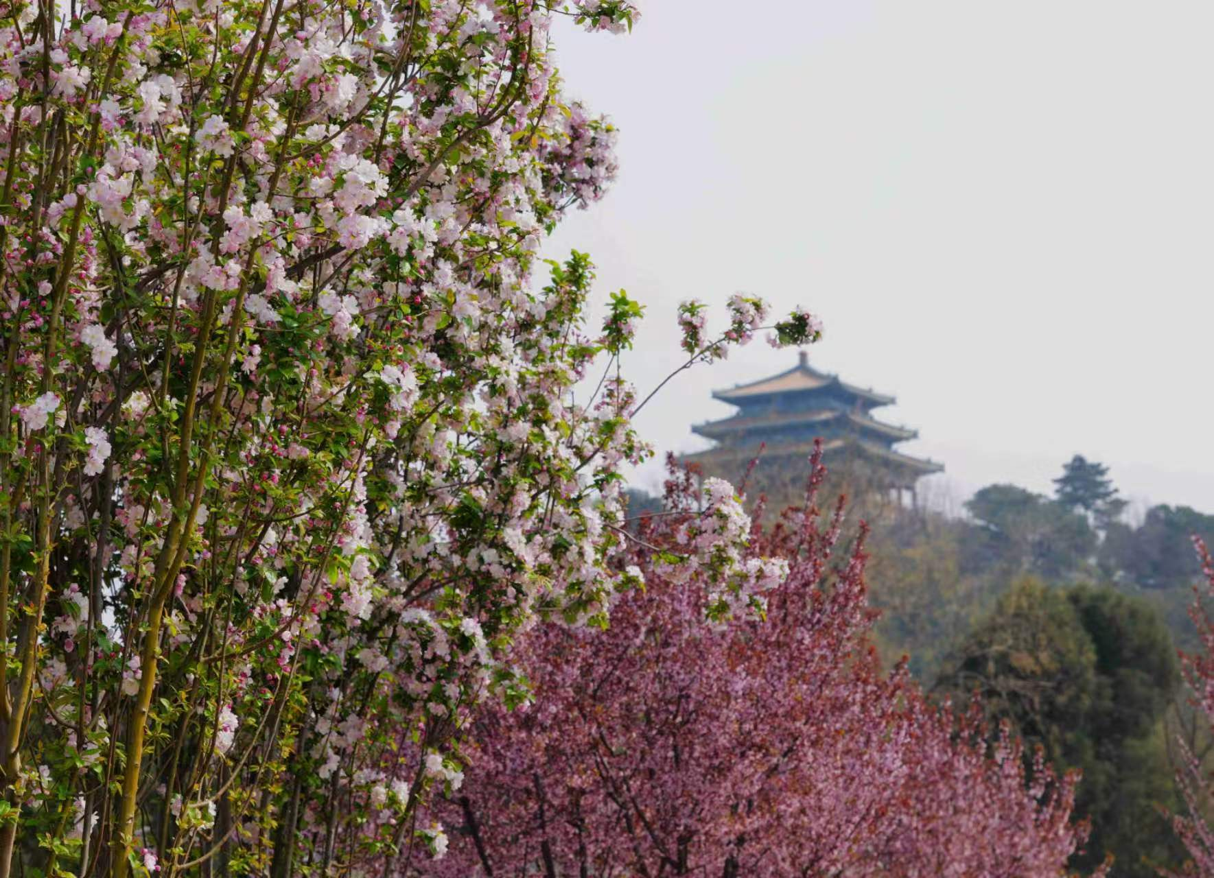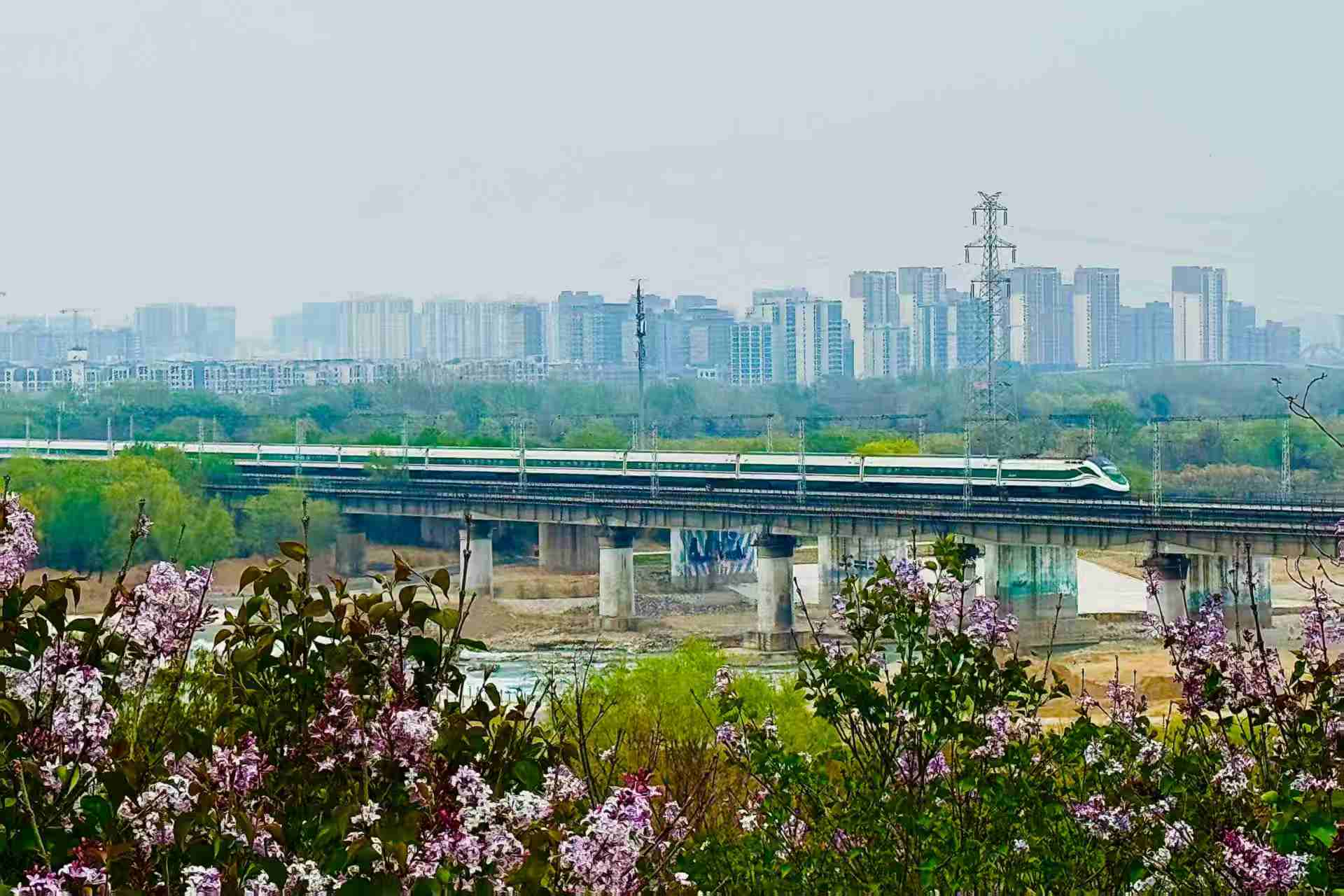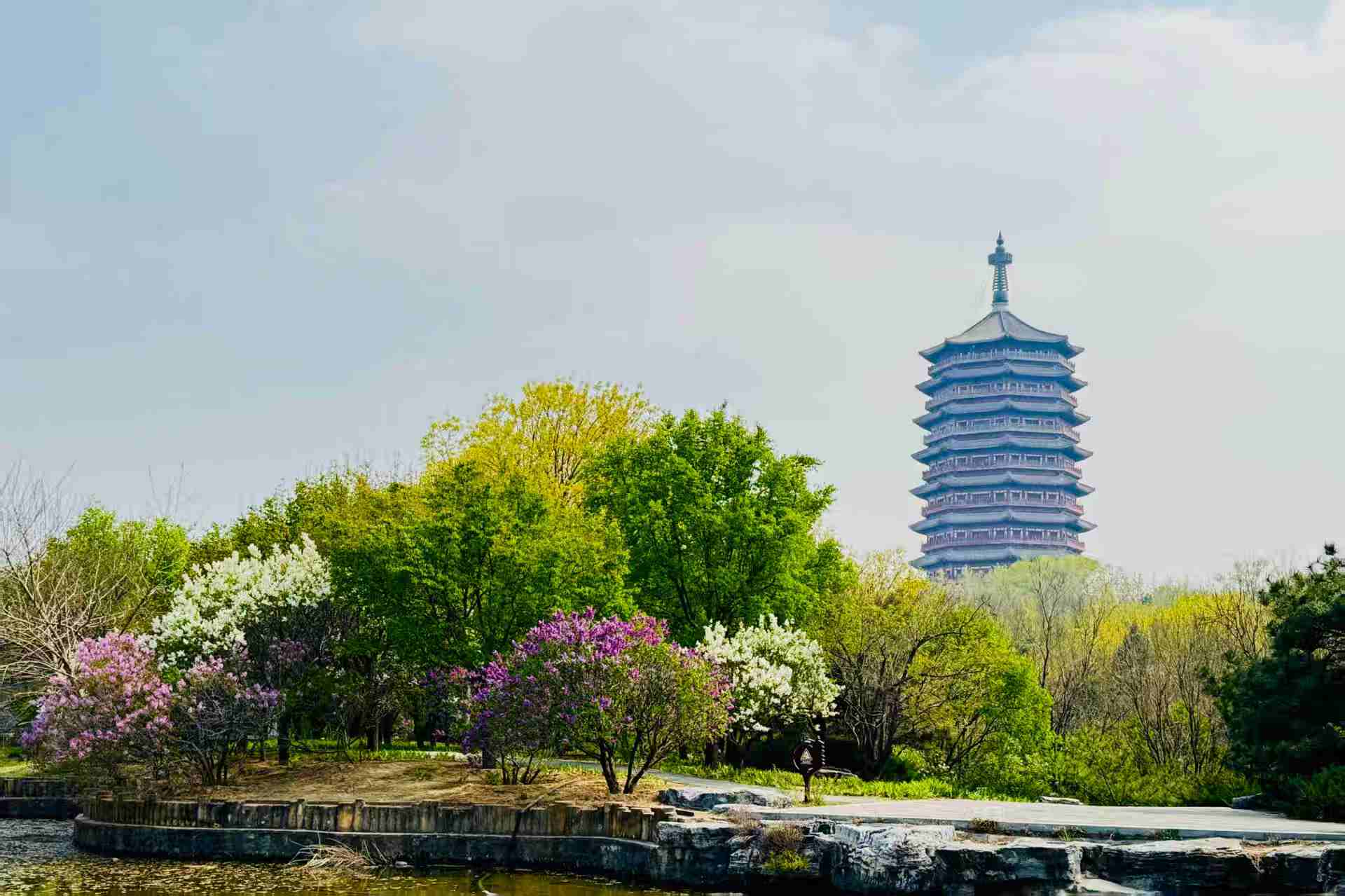 北京园博园鹰山上,丁香盛开,香风吹拂。永定塔、文昌阁在春色的映照下,古色古香。桃花谷下,透过丁香花丛,眺望穿行的高铁,别有一番情趣!