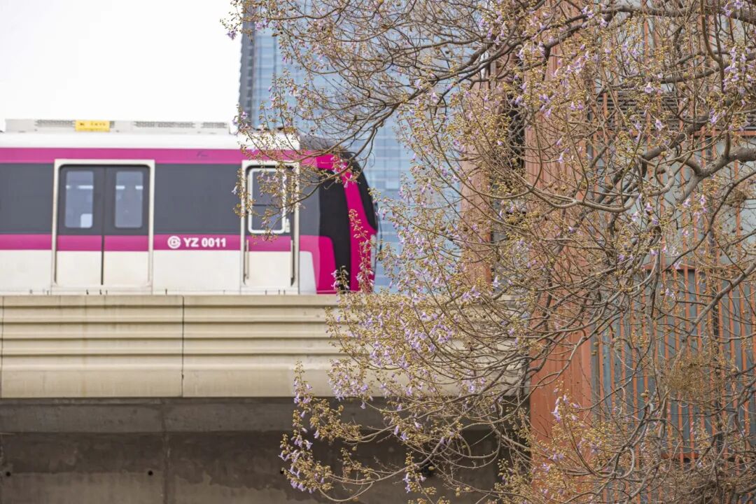 最浪漫的莫过于搭乘亦庄线地铁看列车缓缓穿行于泡桐花海之上。紫红色的车身与漫天紫花交织,成就“开往春天的列车”的绝美画面。