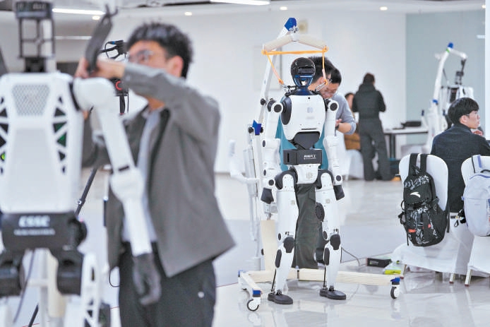 在北京人形机器人创新中心的实训营,高校学生认真调试参赛机器人。本报记者 和冠欣摄