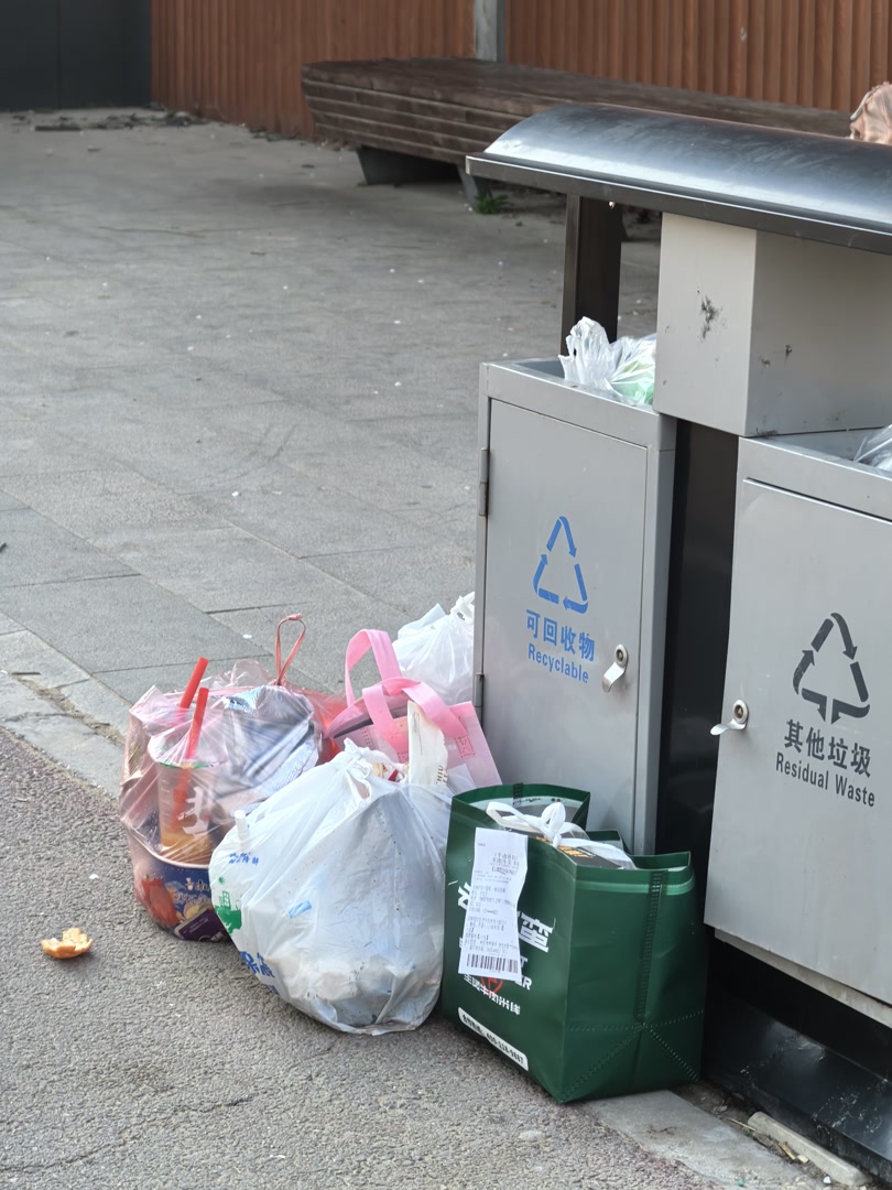 只见一位游客手里拎着两大袋鼓鼓囊囊的垃圾,试着将垃圾袋从窄小的投放口往里塞,可袋子一角刚塞进去,另一角就被卡住,用力按压也没法完全塞进桶内。尝试几次都没能成功,她只好将垃圾袋拿出来,放在桶边的地面上。