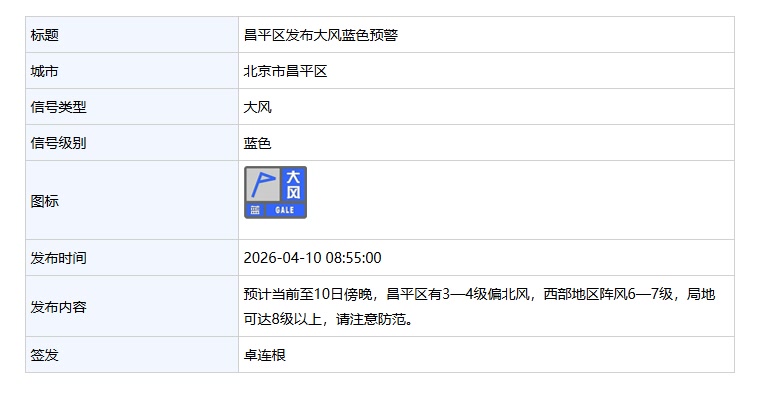 昌平区发布大风蓝色预警