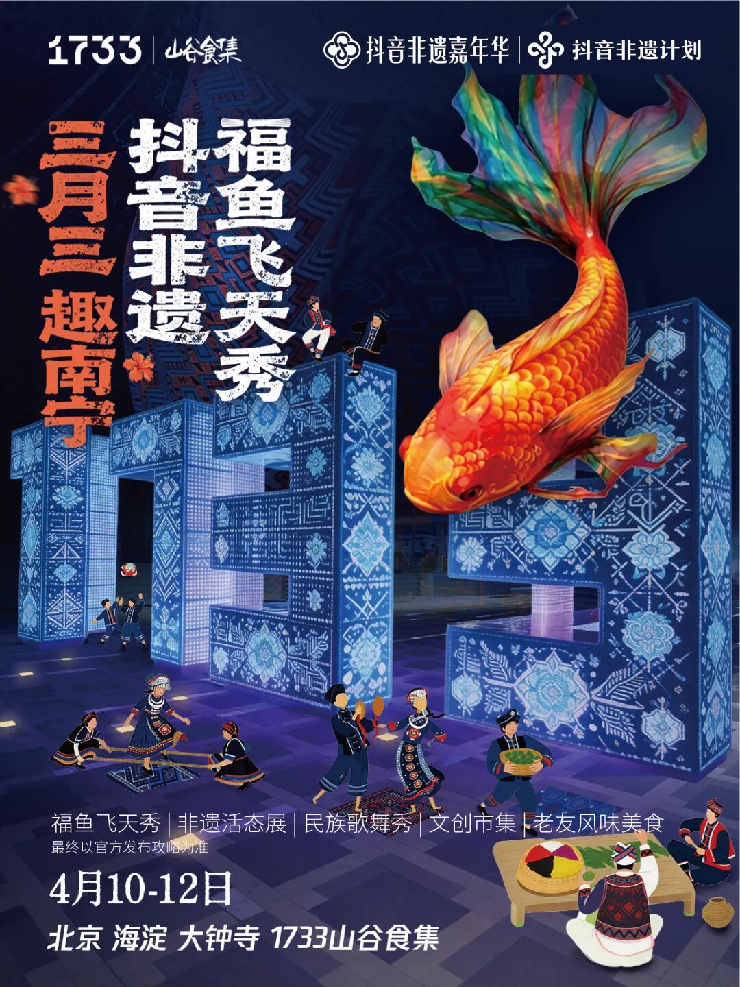 值得一提的是,抖音非遗嘉年华联合抖音创作者@南翔 打造的巨型福鱼空飘火遍全国,该福鱼复刻版将在北京1733山谷食集再次升空,《山海经》中的“文鳐鱼”再一次从书中走进现实。